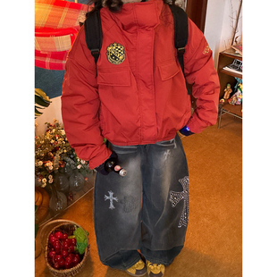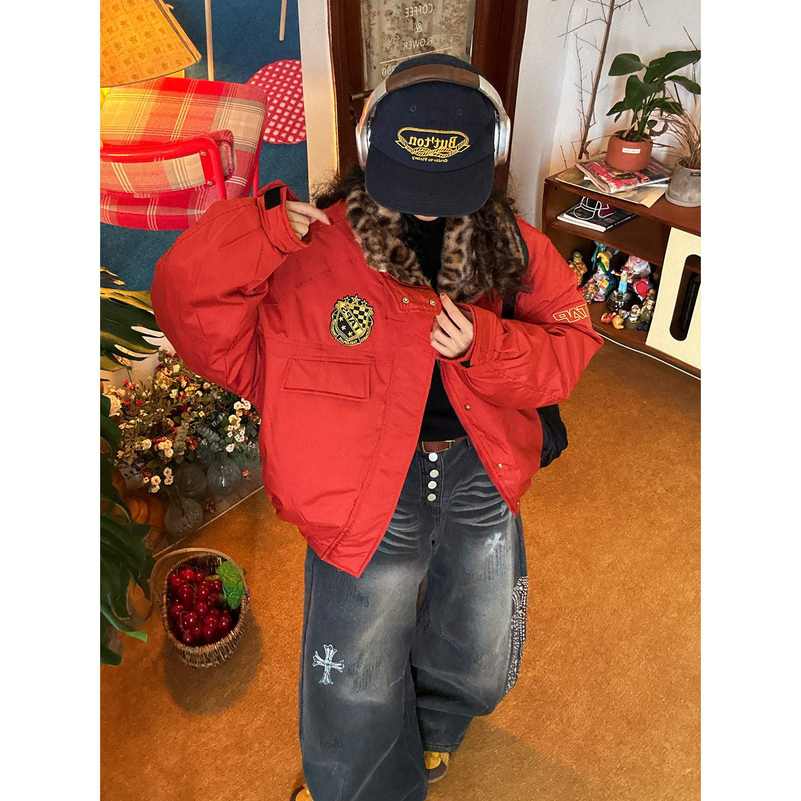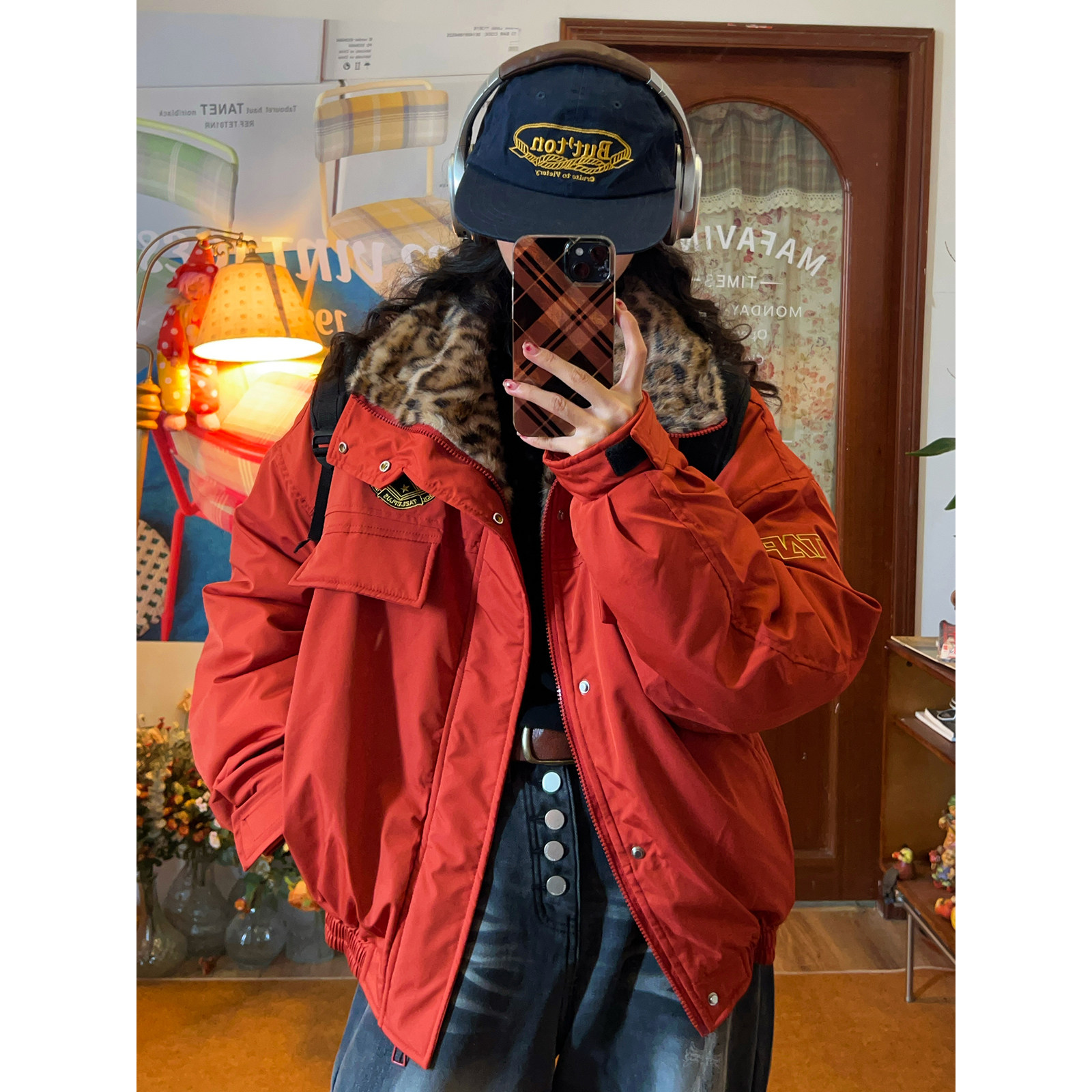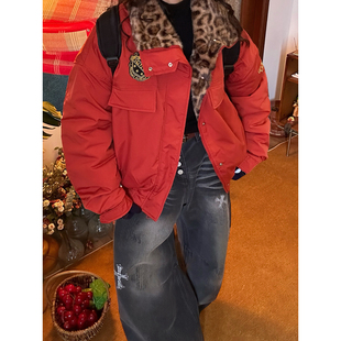 新款 复古豹纹皮毛领棉服女保暖廓形裁剪夹克冬季 外套 美式 C2自制