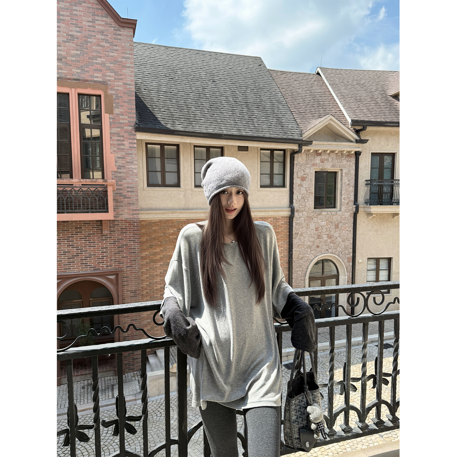 superniniyy 宽松巨显瘦假两件T恤上衣女 灰漾&复古慵懒感拼接长袖