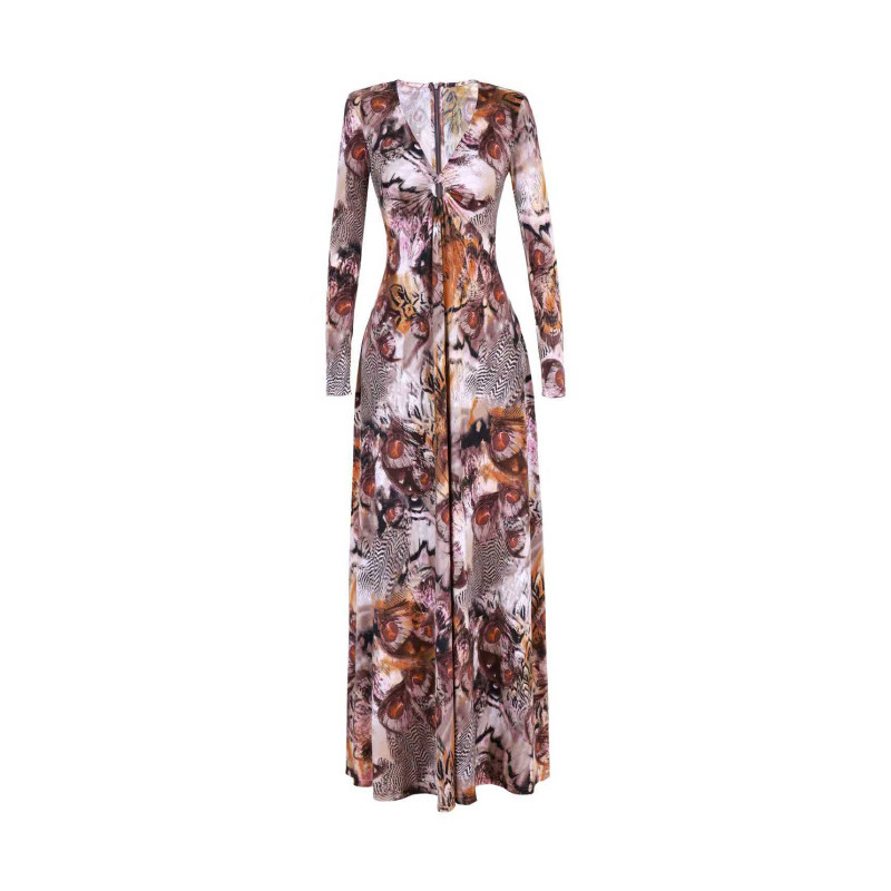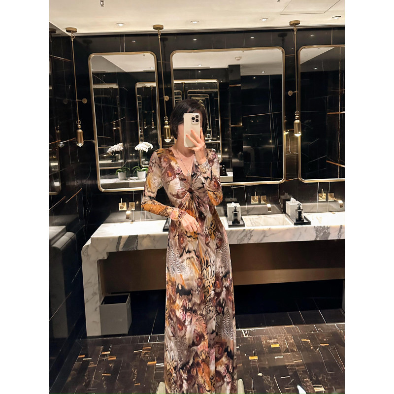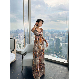 欧美风印花圆领长袖 女装 连衣裙圣诞节晚礼服高腰A字裙子 新款 秋季