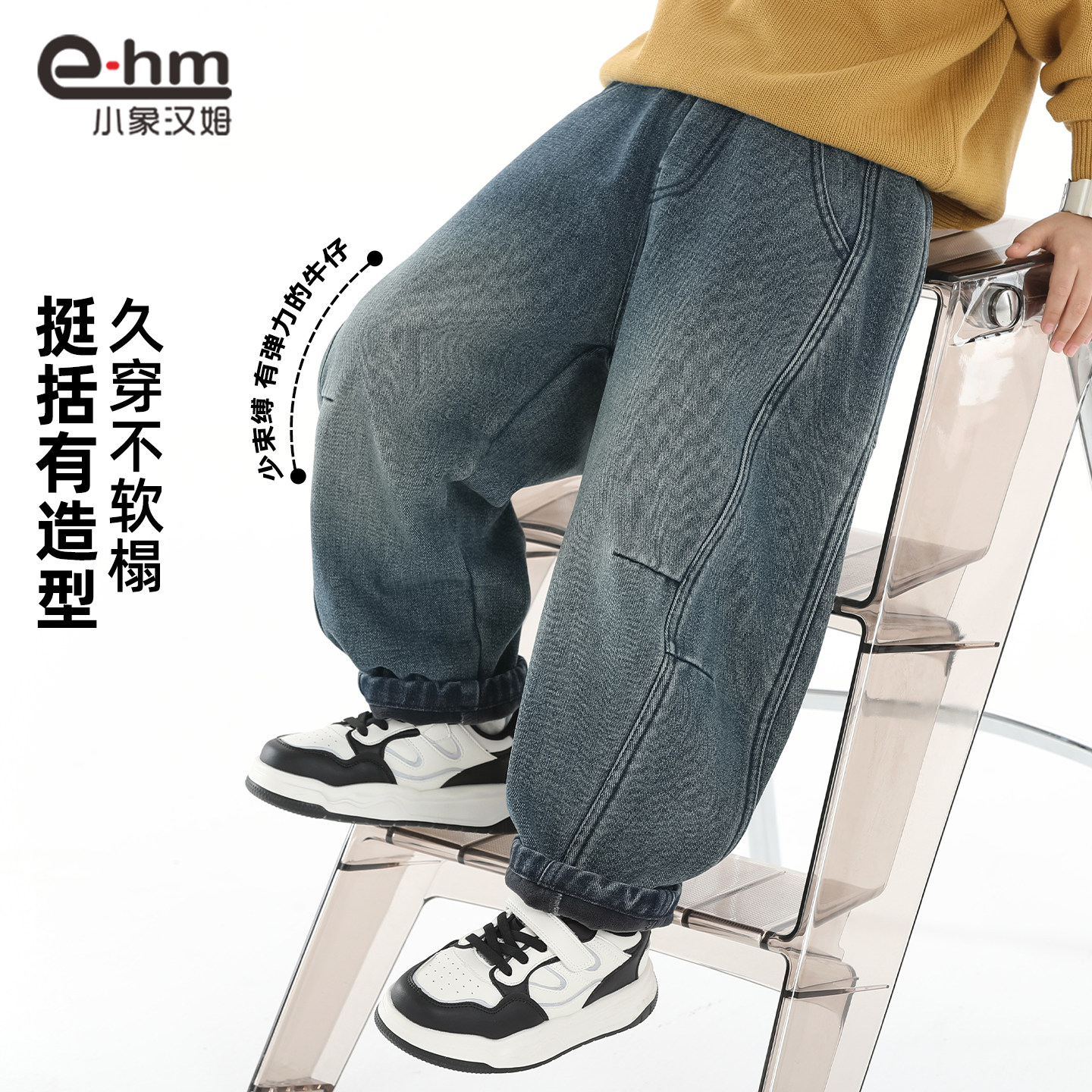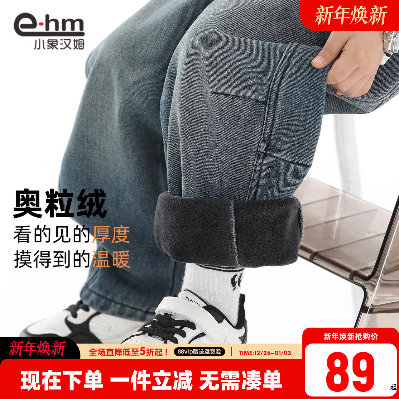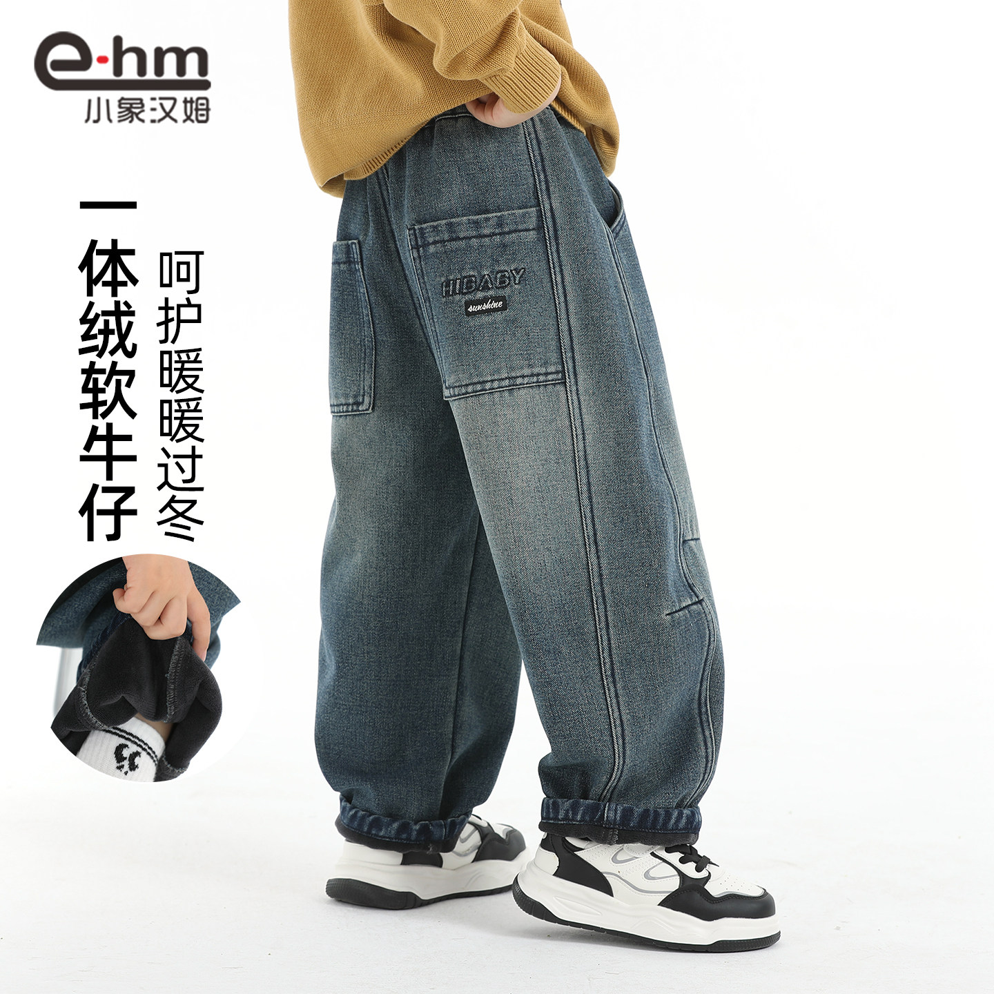 子潮 女秋冬加绒胖妹妹mm高腰显瘦梨型身材裤 大码 蓝灰色直筒牛仔裤