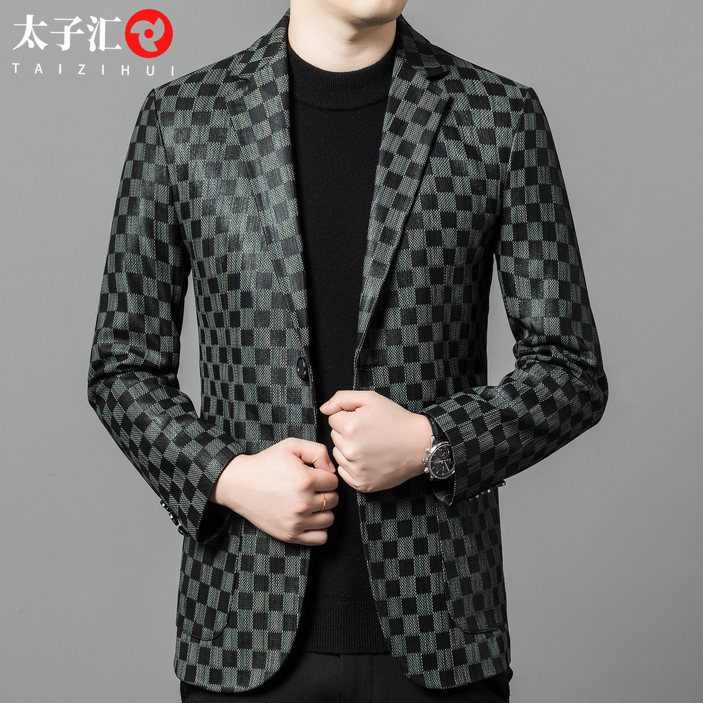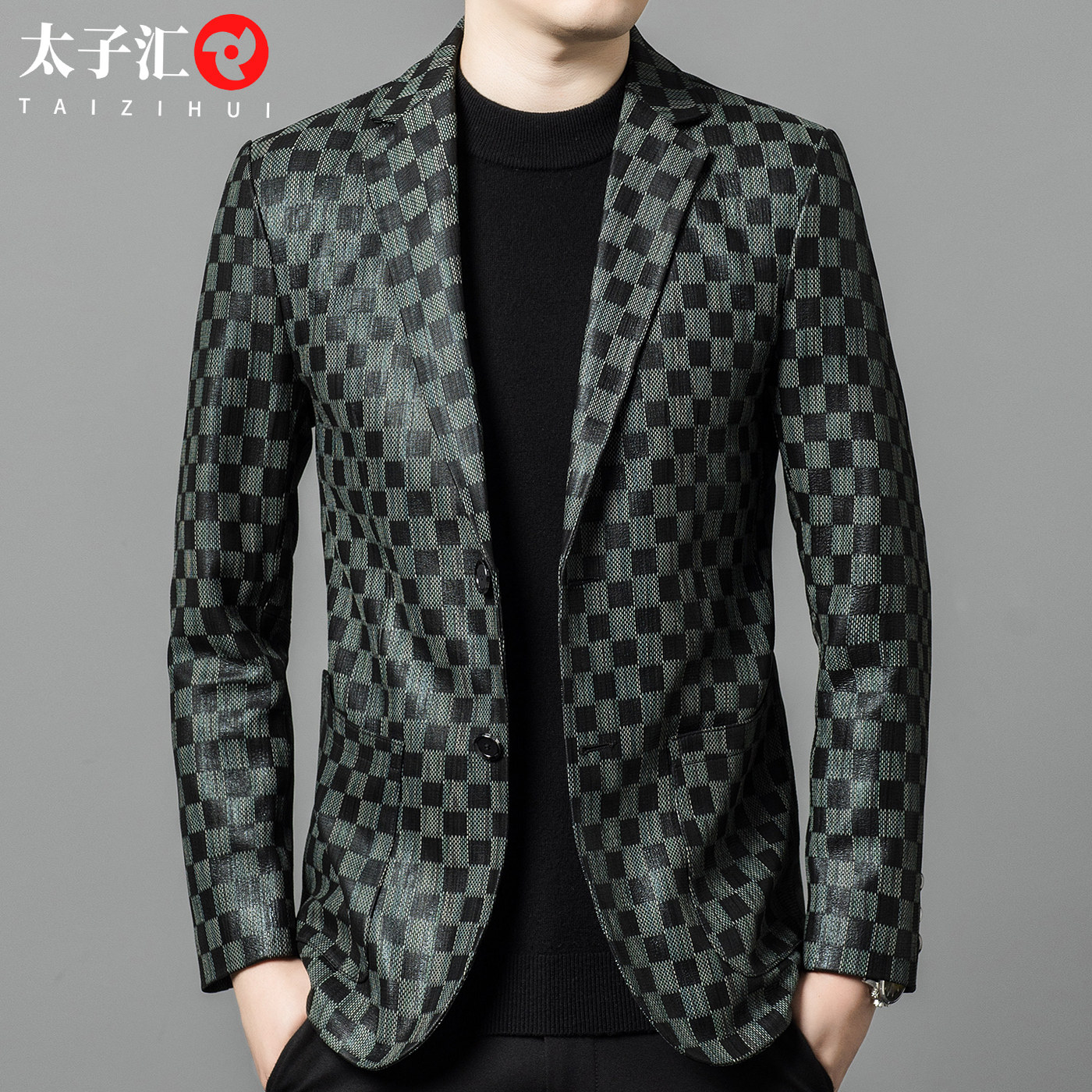 时尚 绵羊皮格子高端休闲皮西服修身 潮流真皮外套 皮衣春秋新款 男士