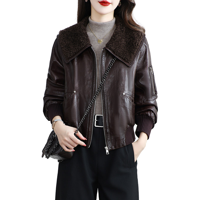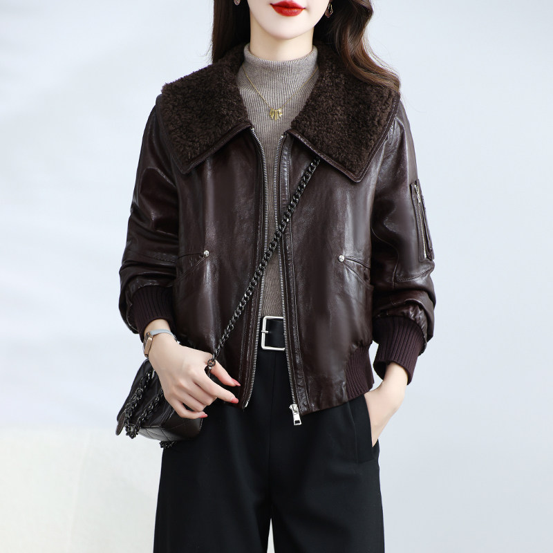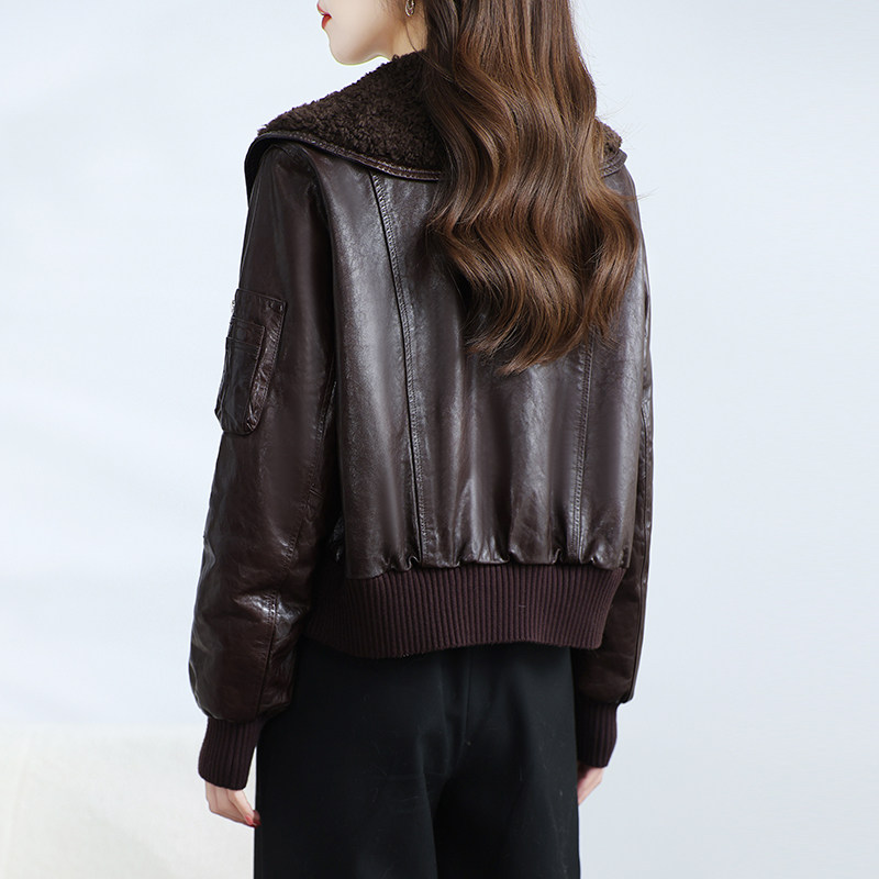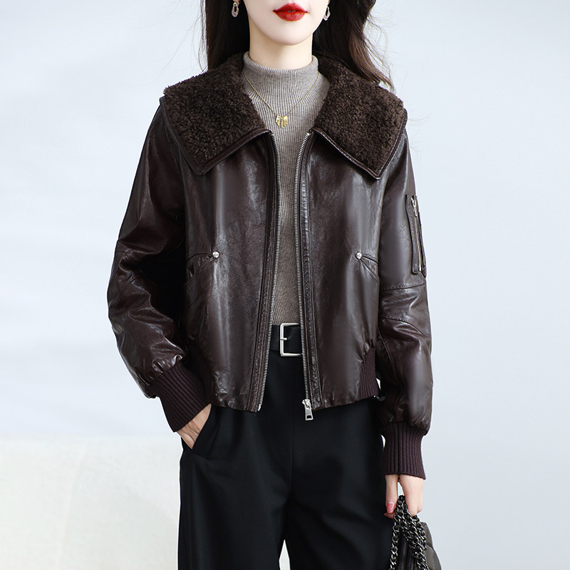 海宁真皮皮衣女短款 高级感油蜡绵羊皮鹅绒服小个子羊毛领外套冬季