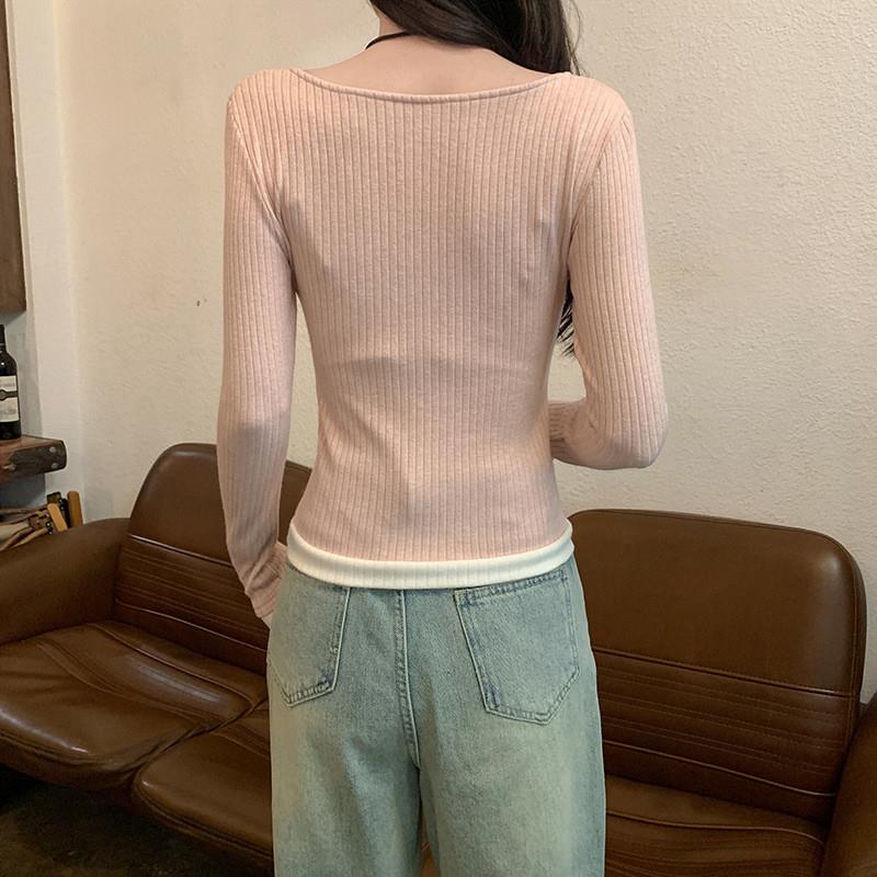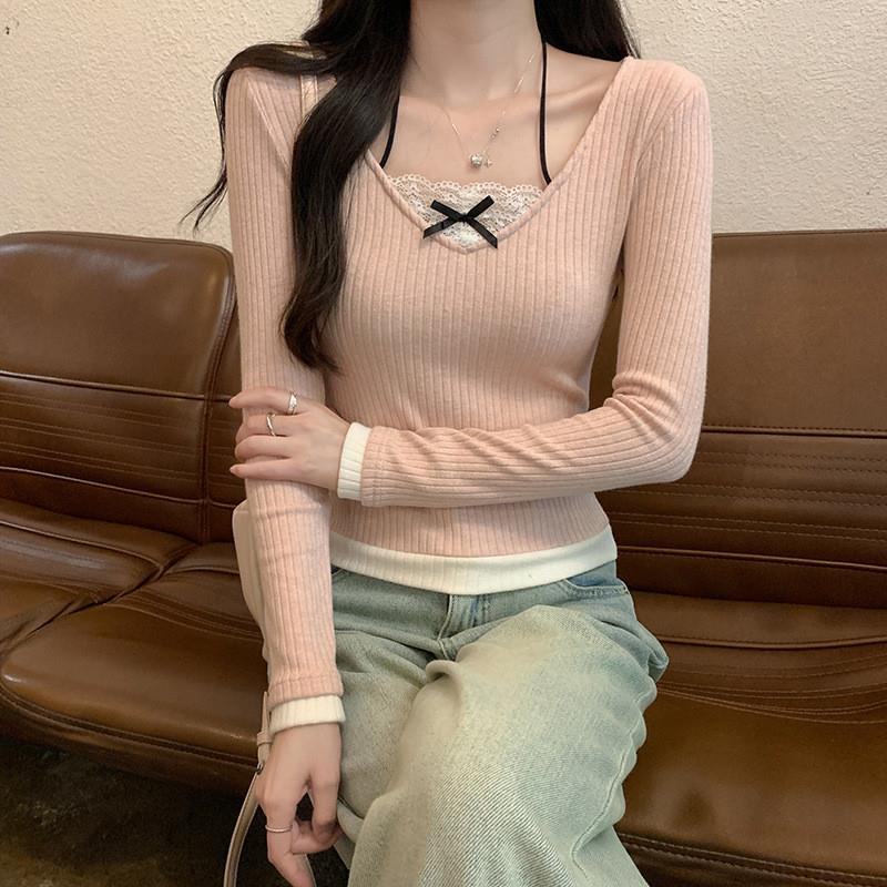 t恤女装 V领韩版 春秋薄款 打底衫 上衣 挂脖2025潮流蕾丝修身 实拍长袖