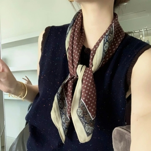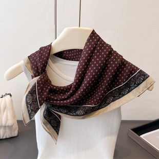 披肩围巾小方巾 高级感时尚 2025新款 复古印花丝巾女咖啡色方巾法式