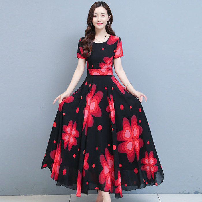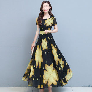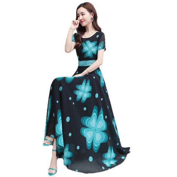 波西米亚圆领雪纺连衣裙收腰显瘦女夏2021新款 气质裙子沙滩裙长裙