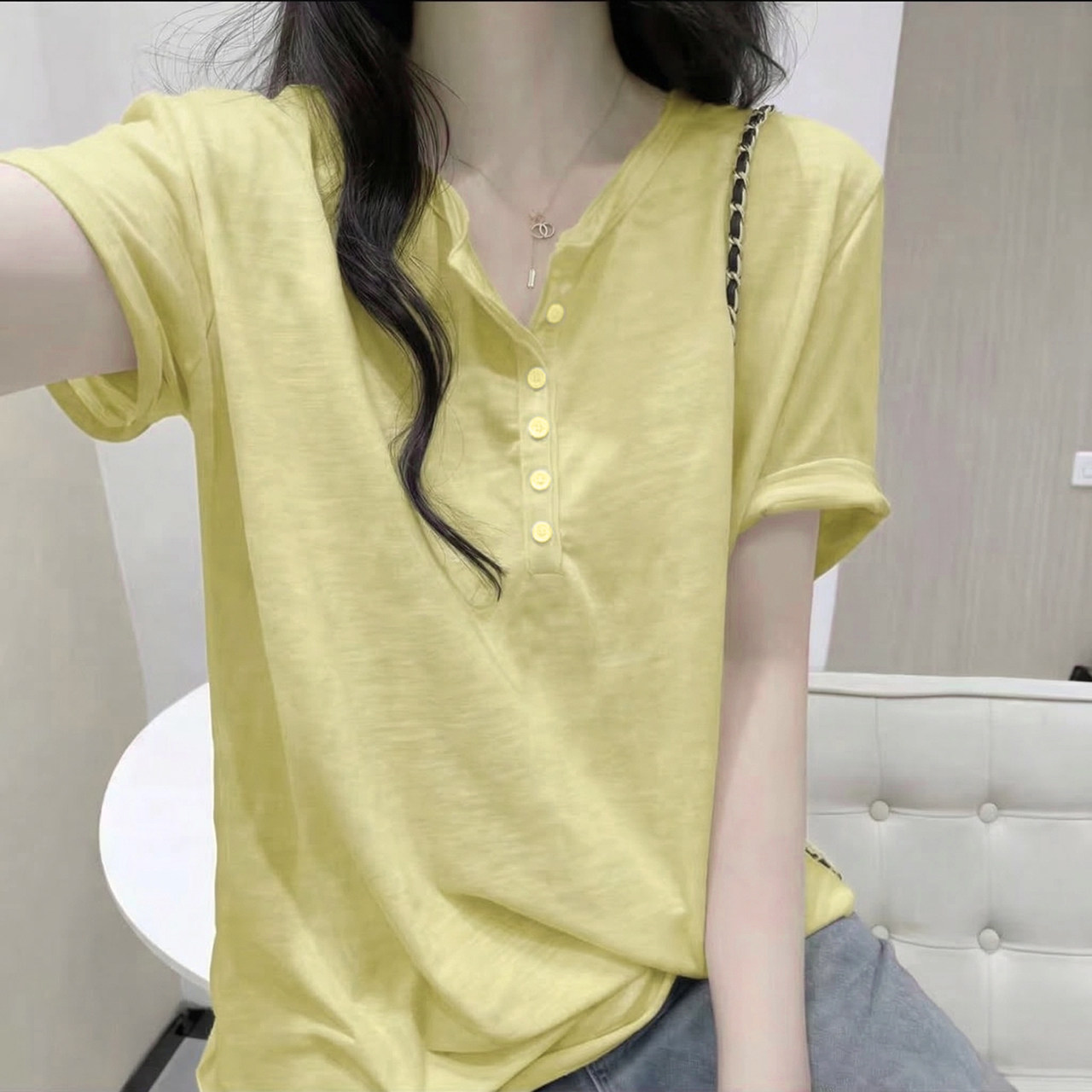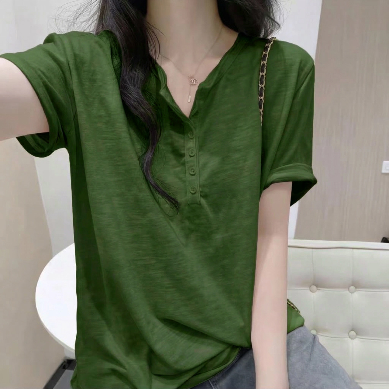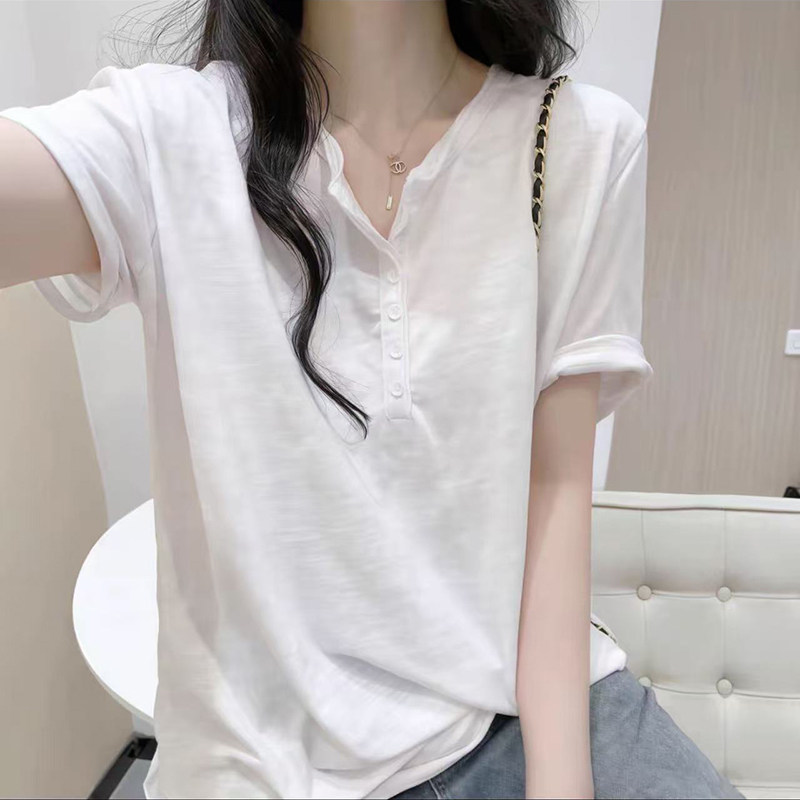 大码 新款 宽松洋气减龄休闲百搭上衣 t恤女士夏季 小V领纽扣纯棉短袖