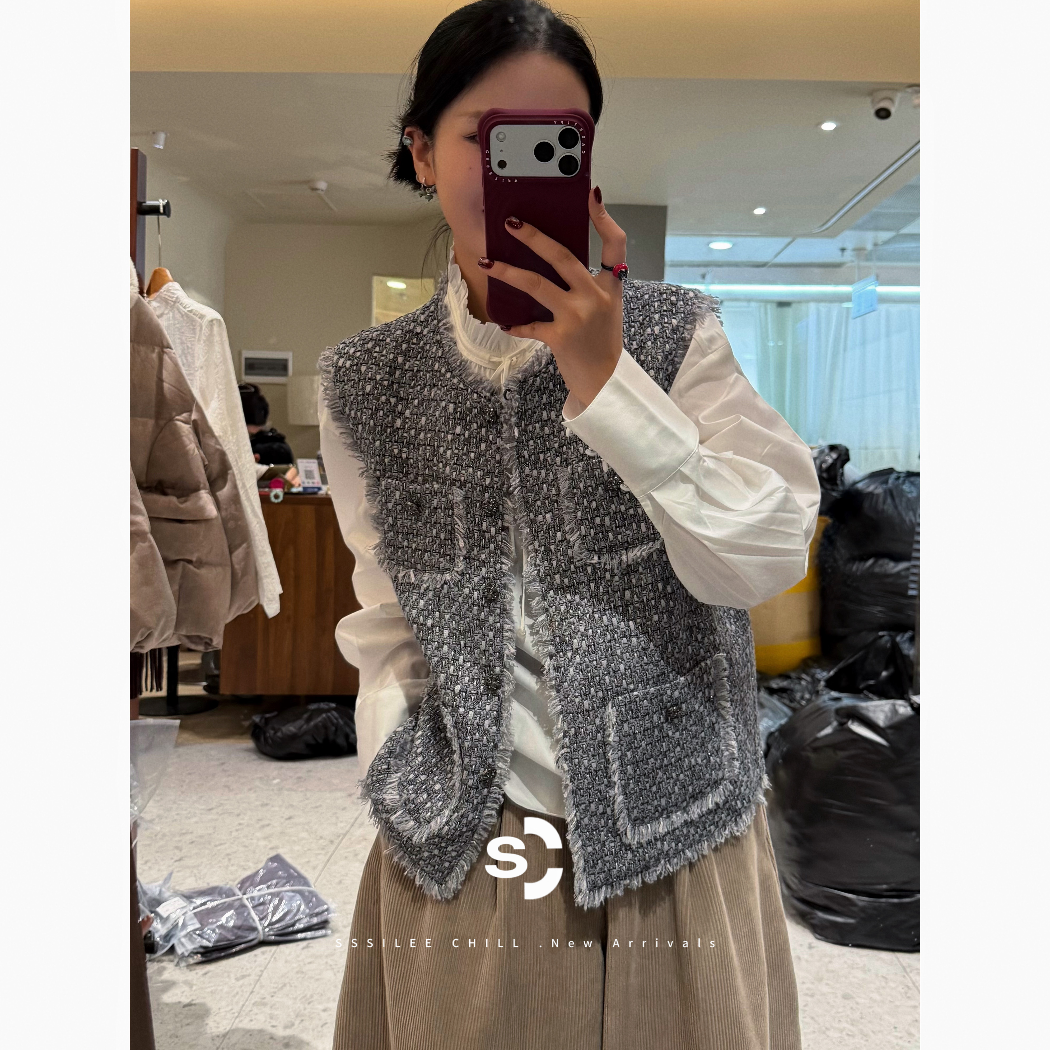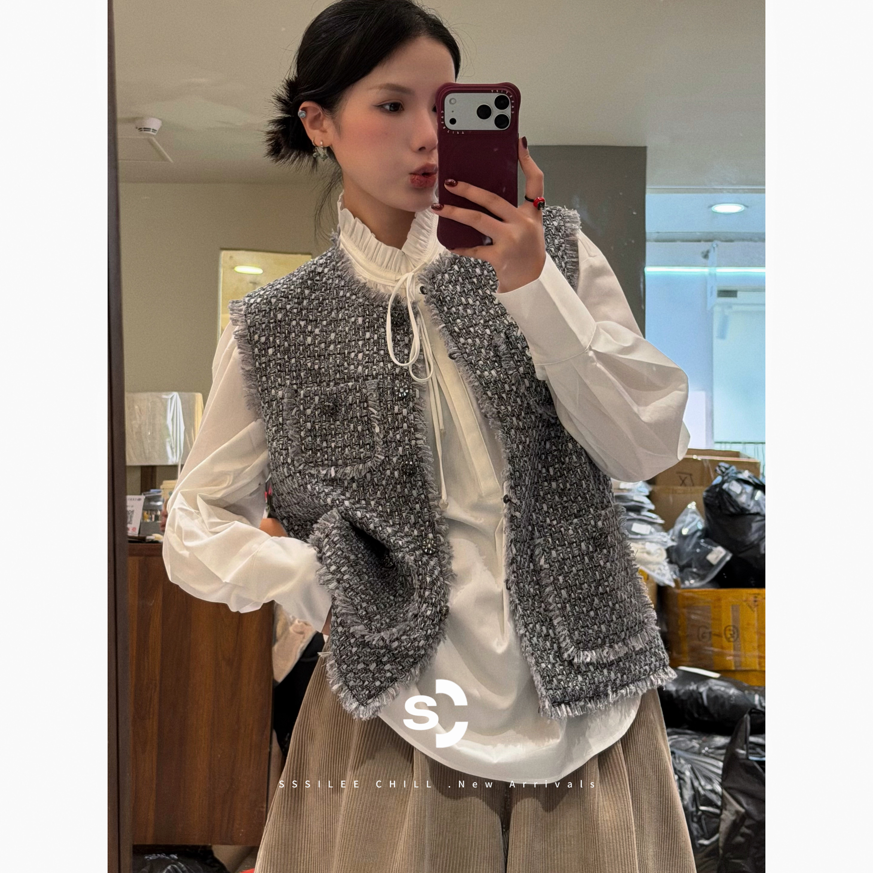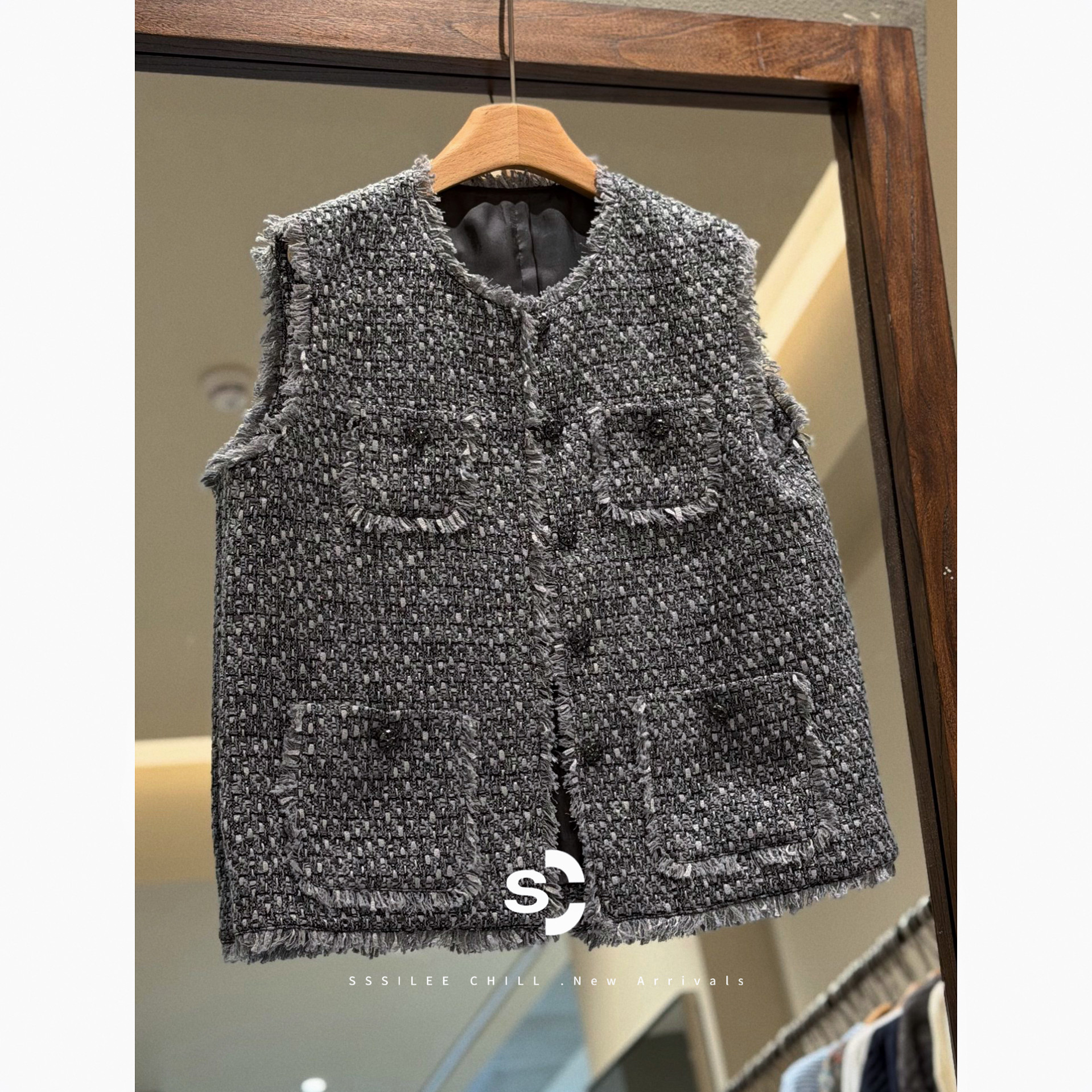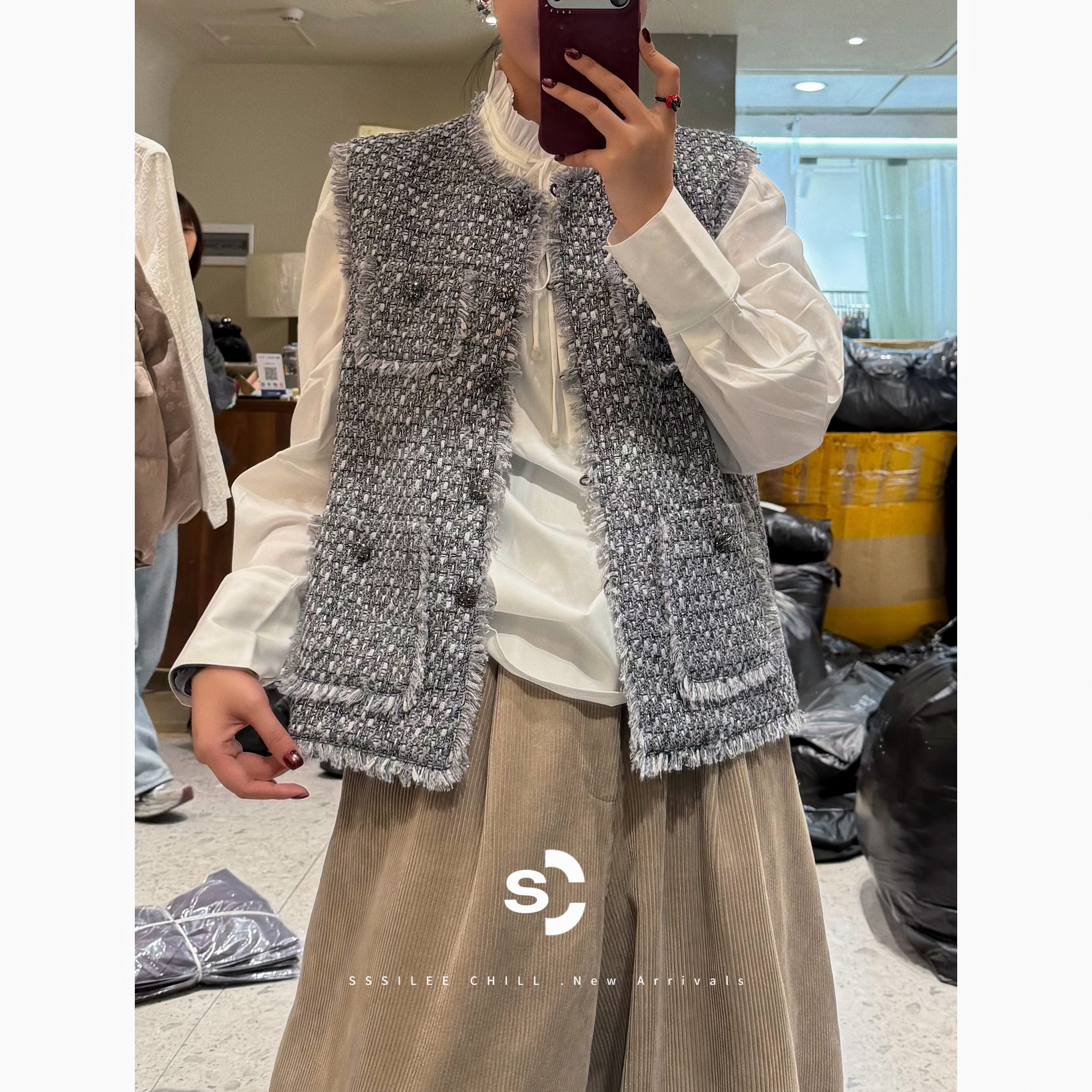 重工肌理感羊毛粗花呢廓形香风马夹 法式 月泊银灰 736093