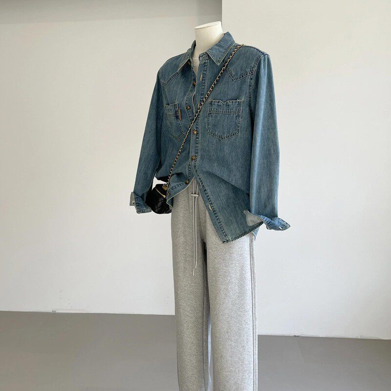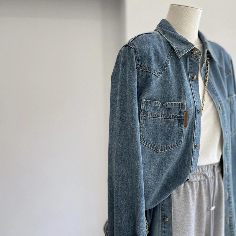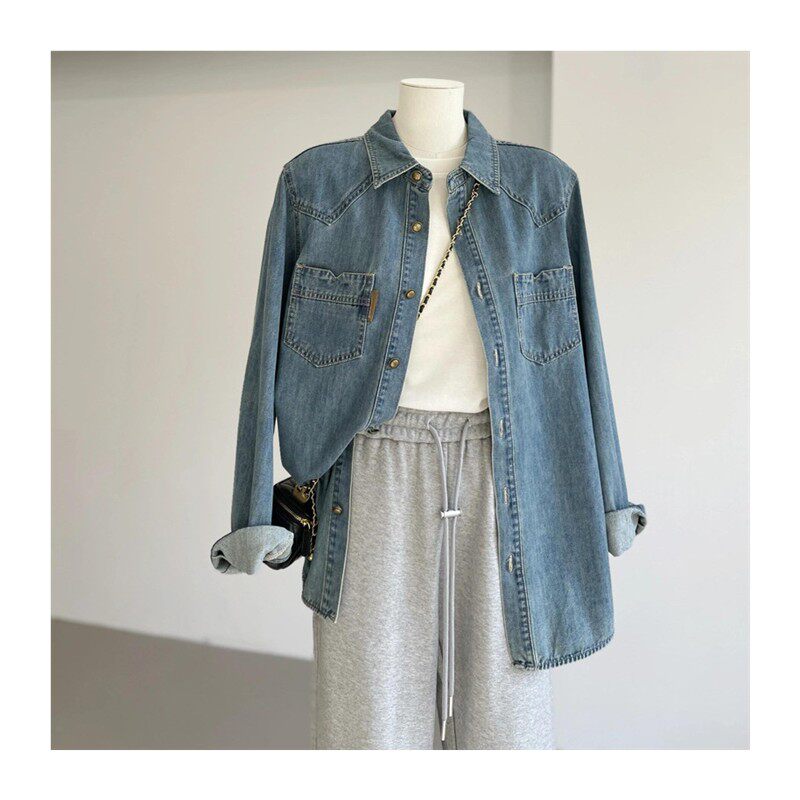 推荐 新款 法式 女2025秋季 叠穿气质上衣 复古蓝色牛仔衬衫 自留爆款