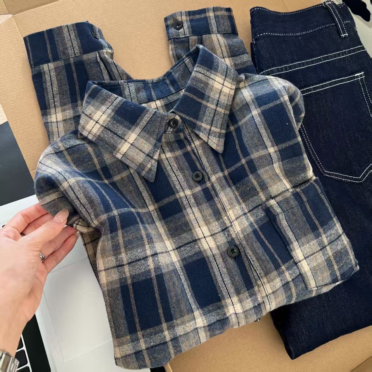 2026韩版 外套女休闲深蓝格纹衬衣百搭叠穿潮 宽松显瘦复古格子衬衫