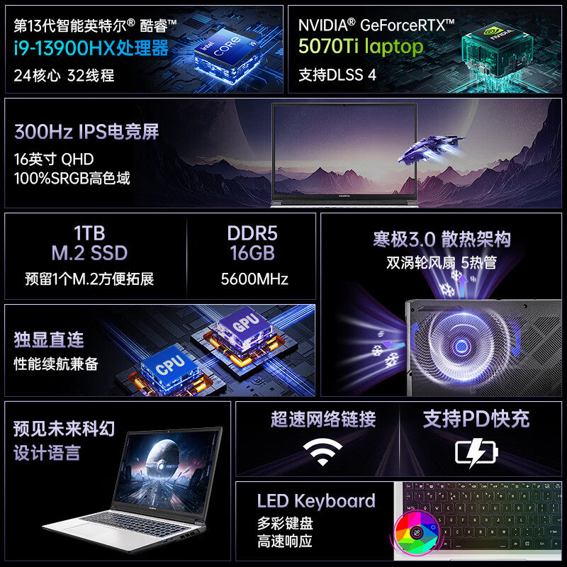 RTX5070Ti 13900HX 300HZ独显游戏本电脑 七彩虹隐星P16PRO
