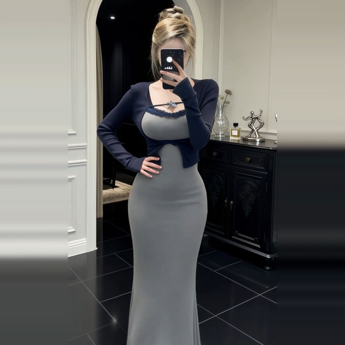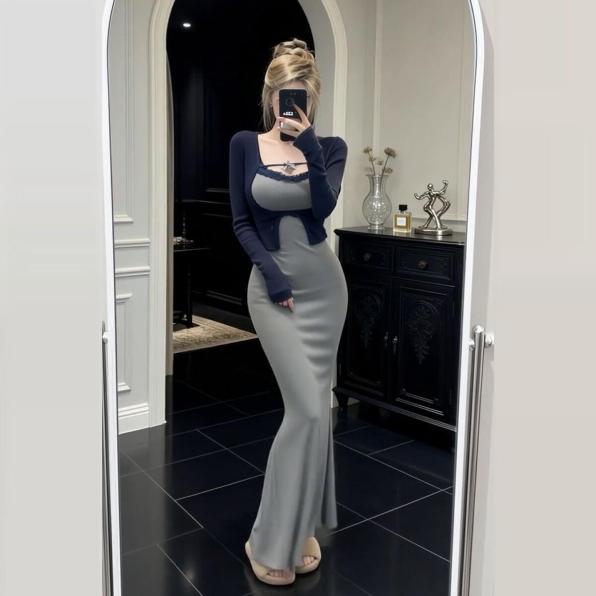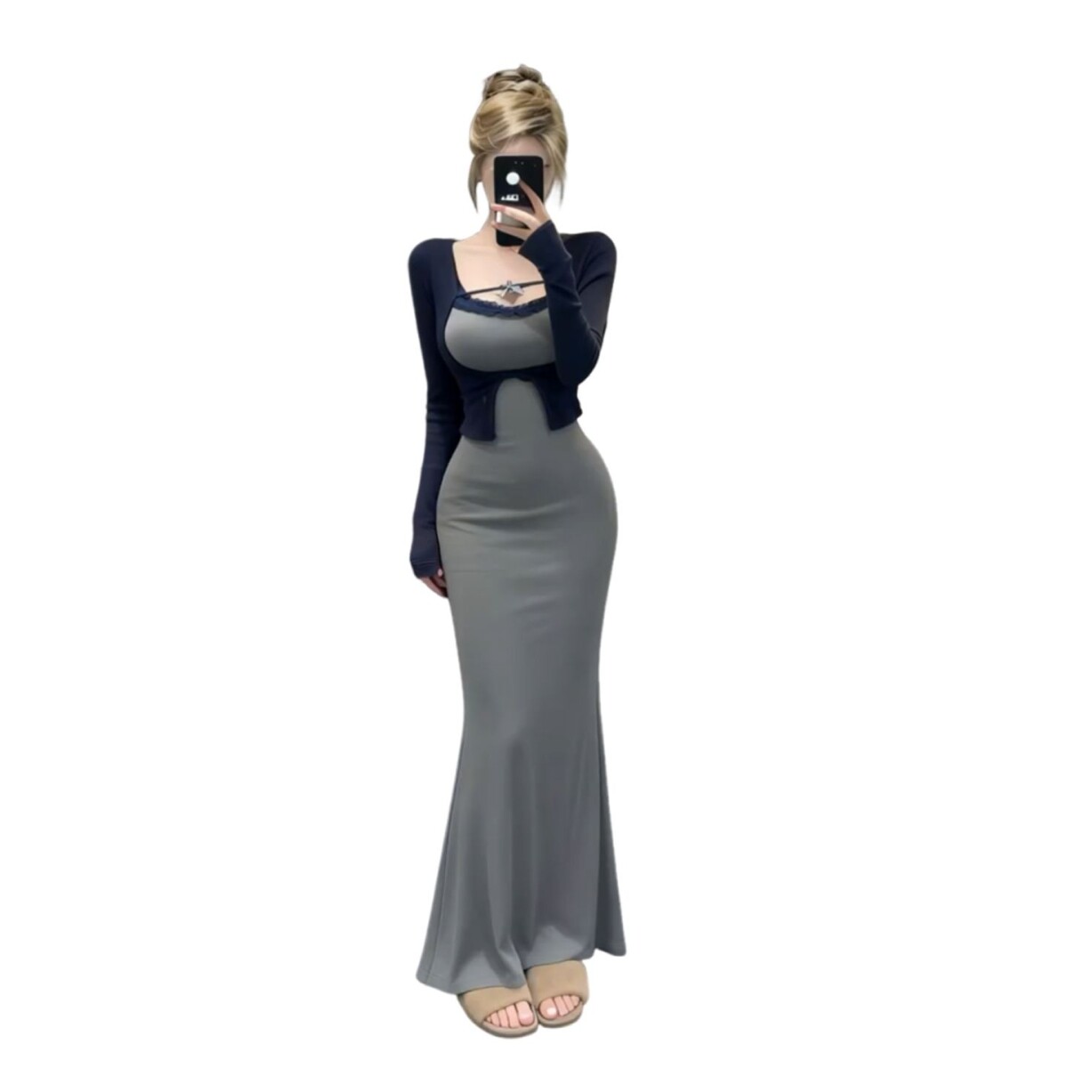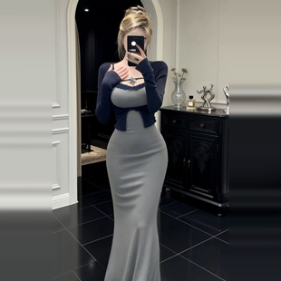 连衣裙子女秋冬高级感修身 灰色针织套装 包臀鱼尾长裙 新款 2026春季