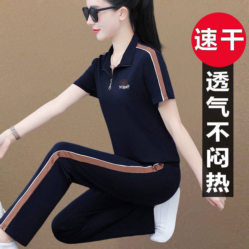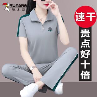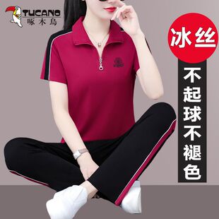 长裤 啄木鸟冰丝女士休闲运动套装 妈妈中年两件套短袖 新款 女夏季