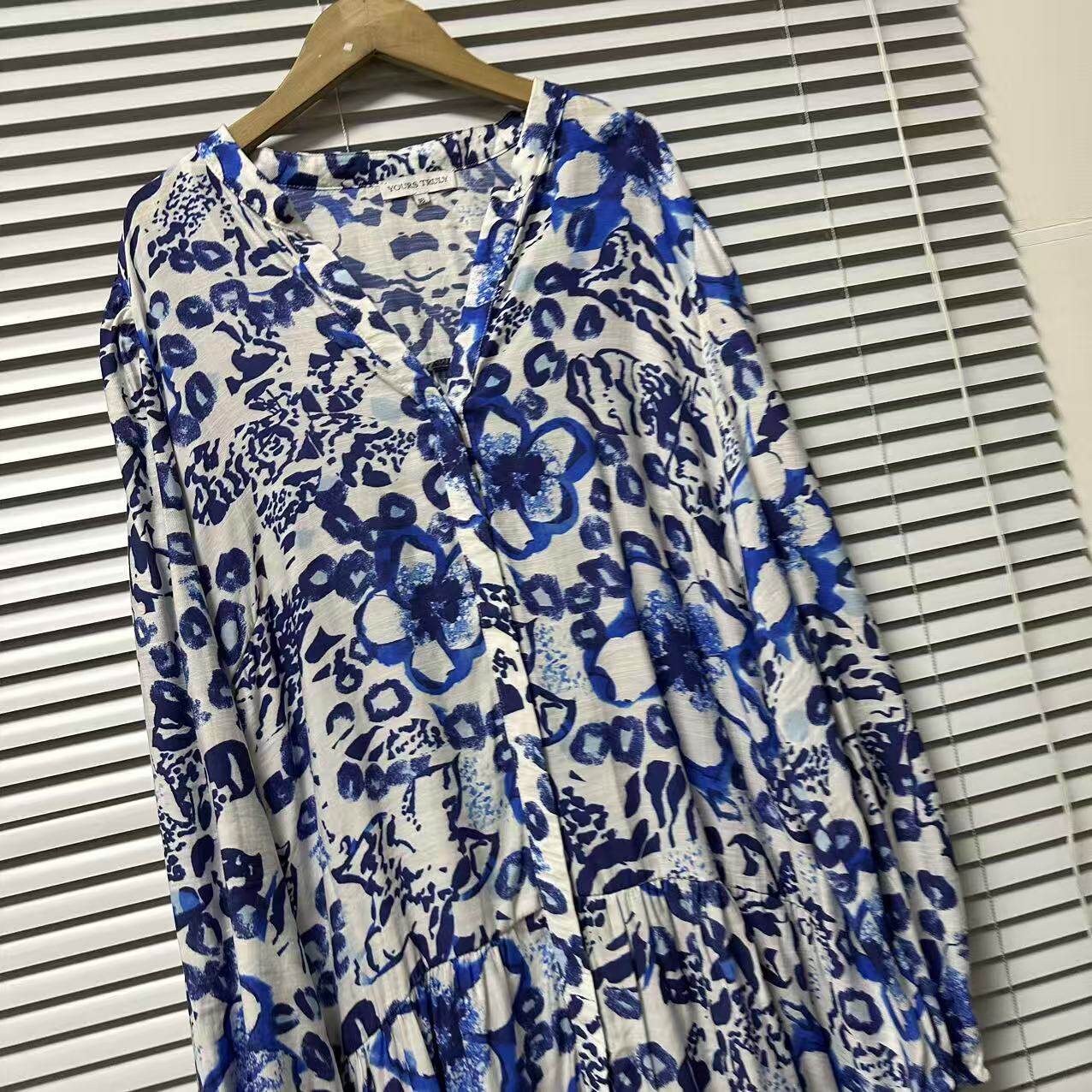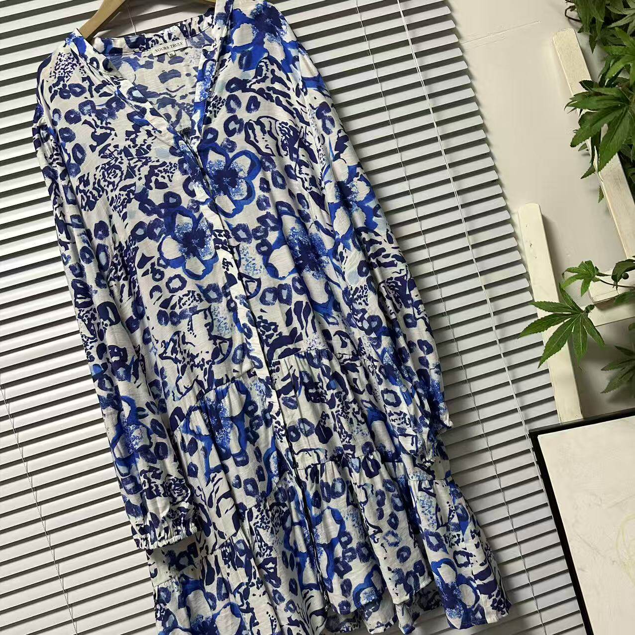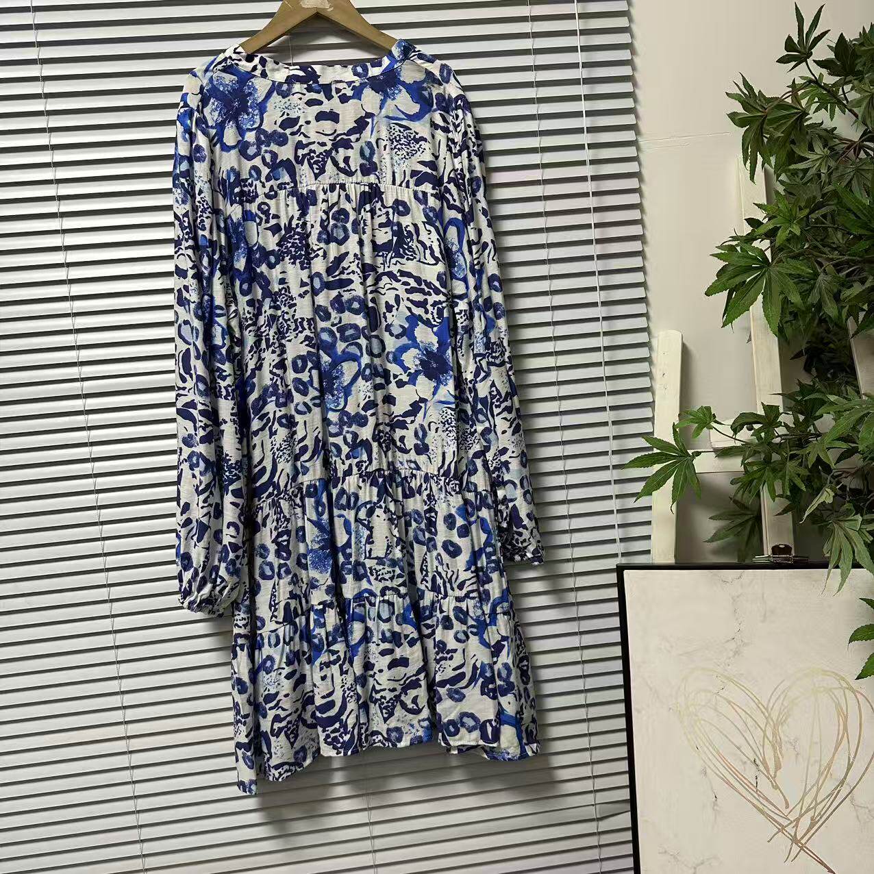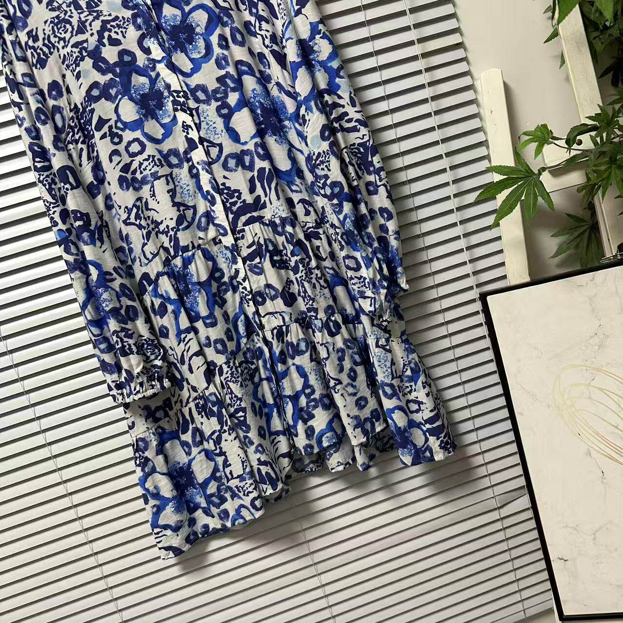连衣裙女装 休闲印花气质中长款 宽松蓝色复古 25法国单长袖 0325