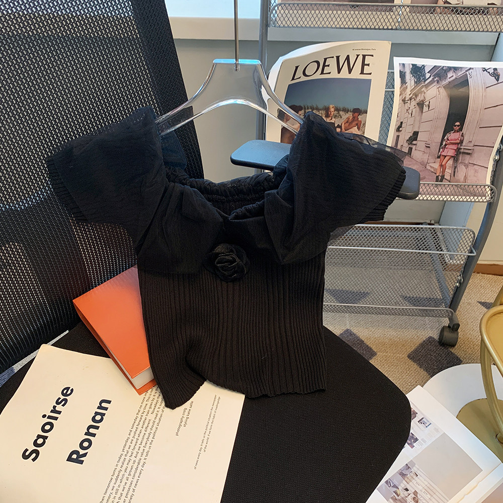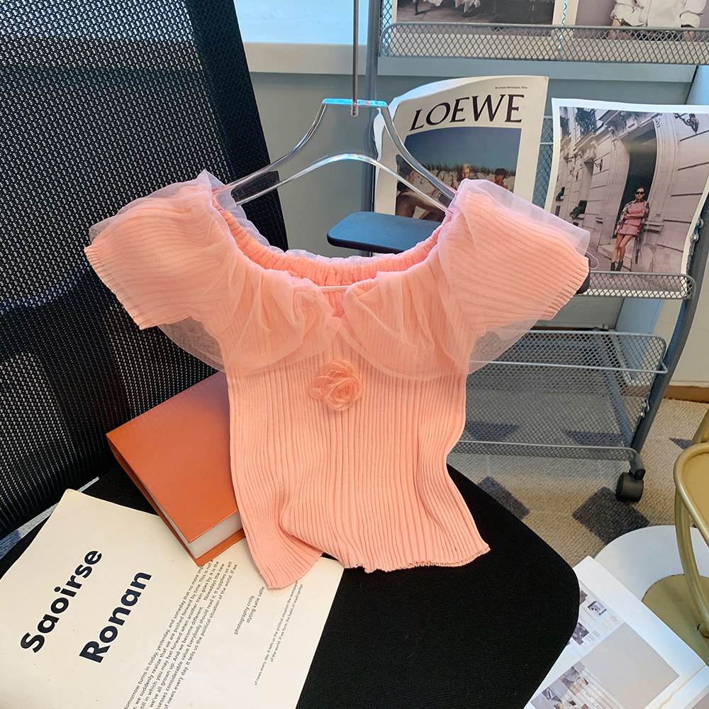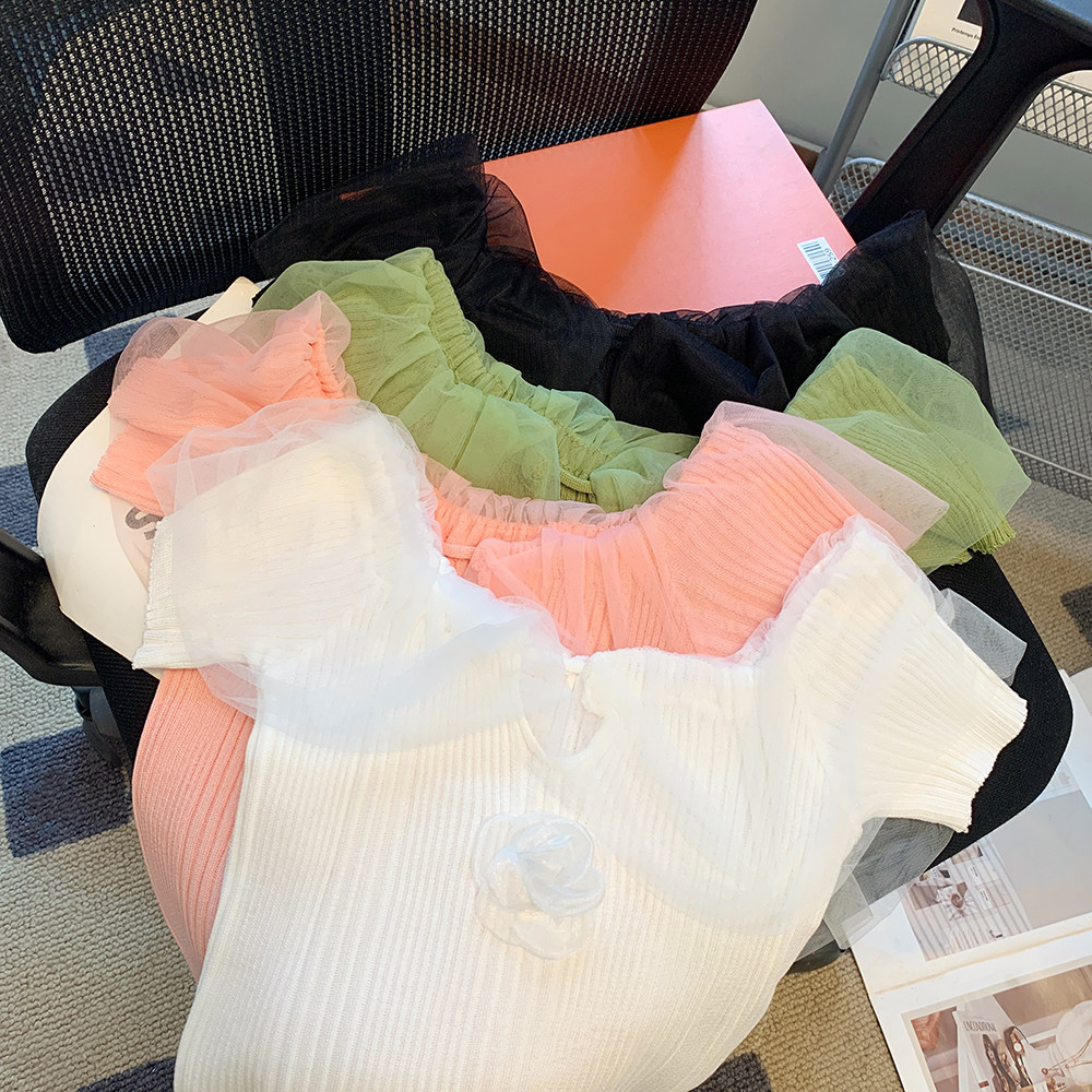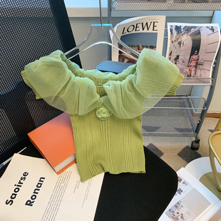 针织衫 女装 XXXS显高一字肩拼接网纱短款 150cm矮个子加小码 女 夏装