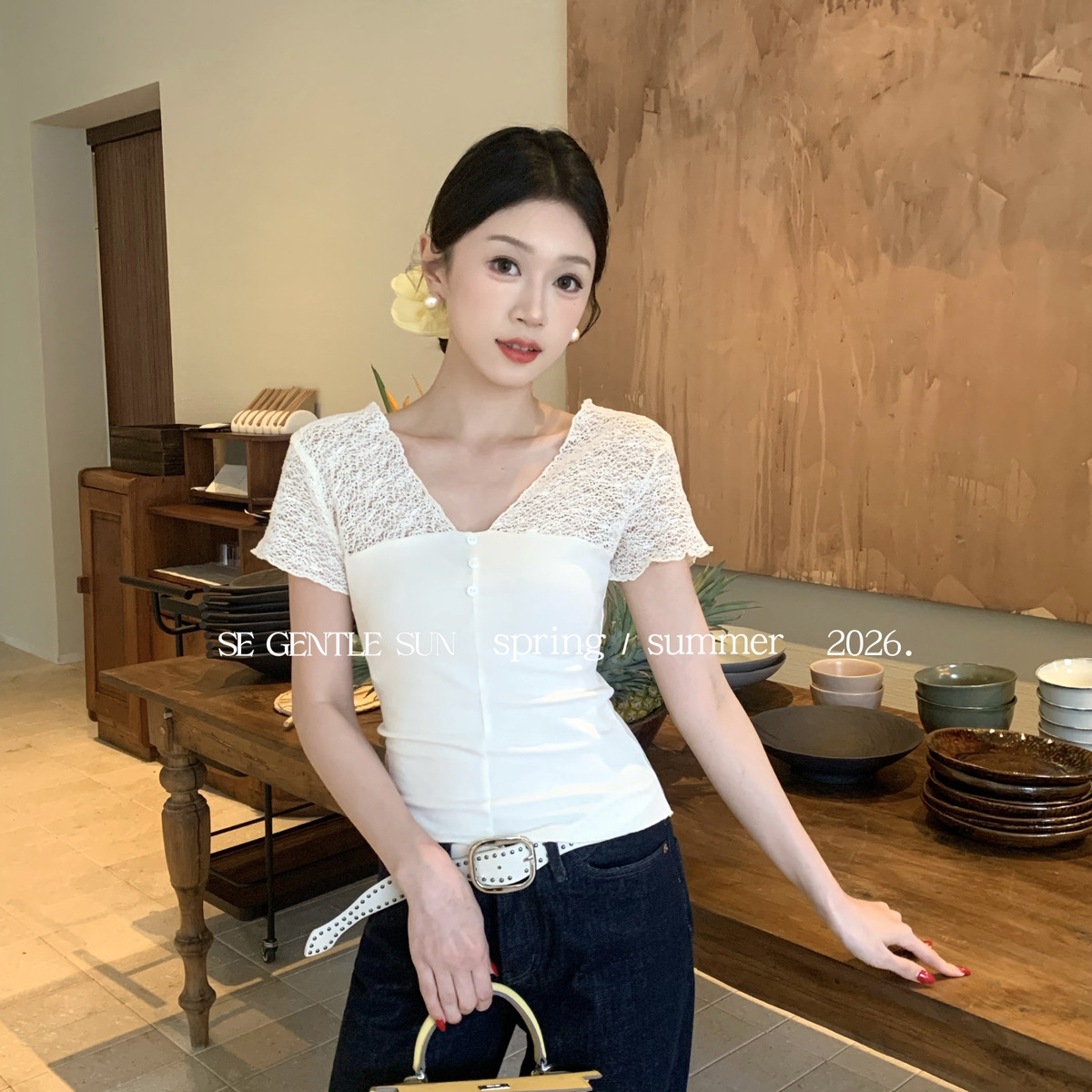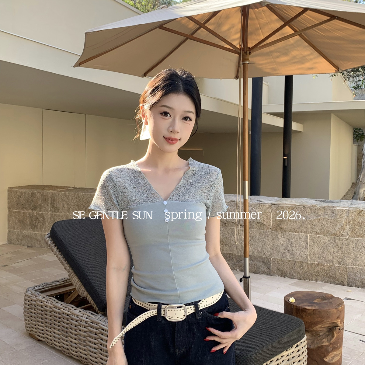 GENTLE 收腰短袖 SUN King韩系蕾丝拼接V领修身 T恤89676 标爆款