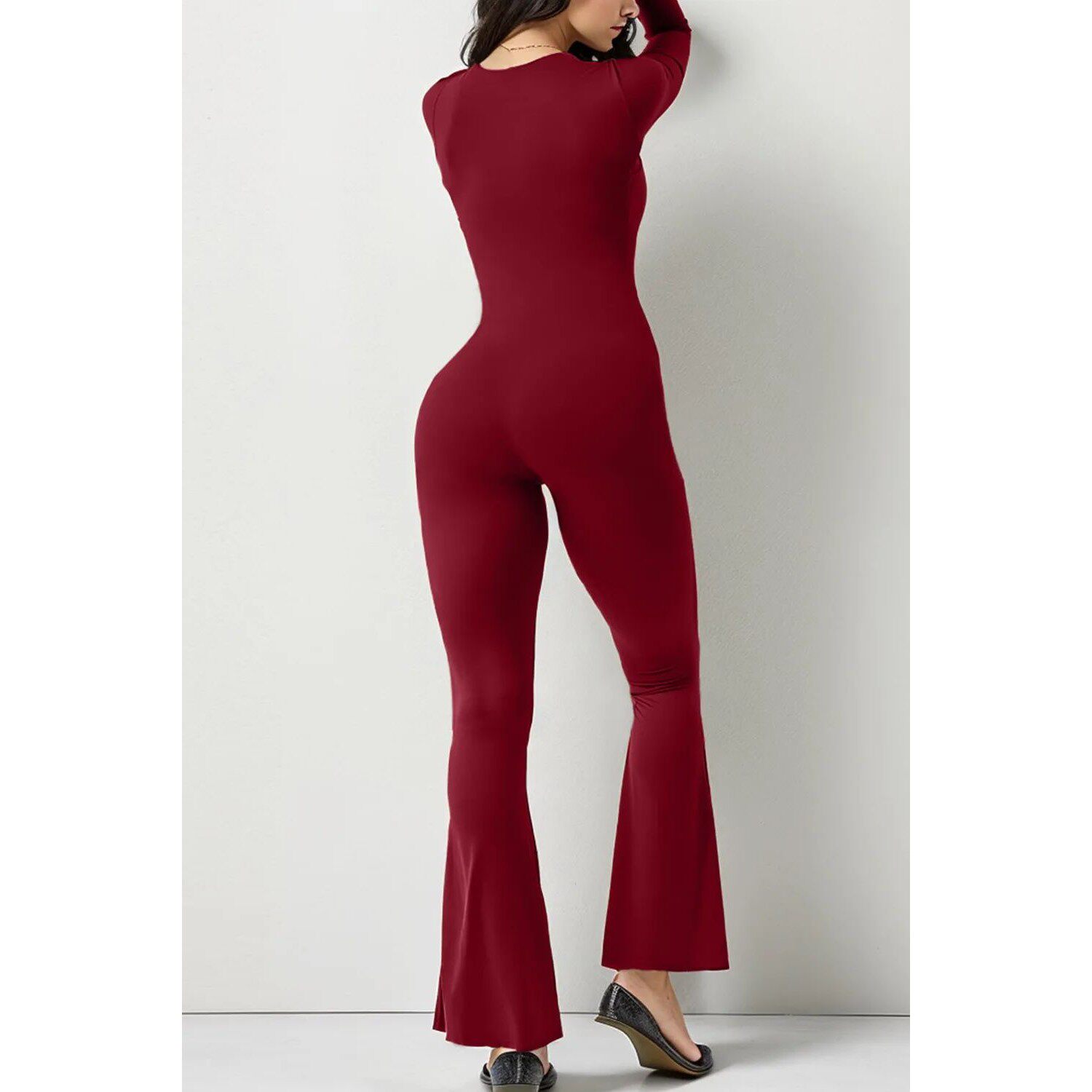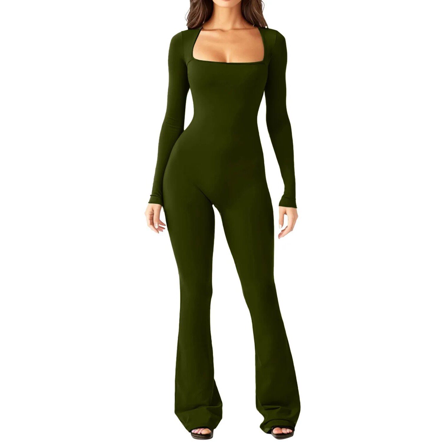 sleeved square neck 长袖 leg Long wide jumpsuit 收腹方领连体裤