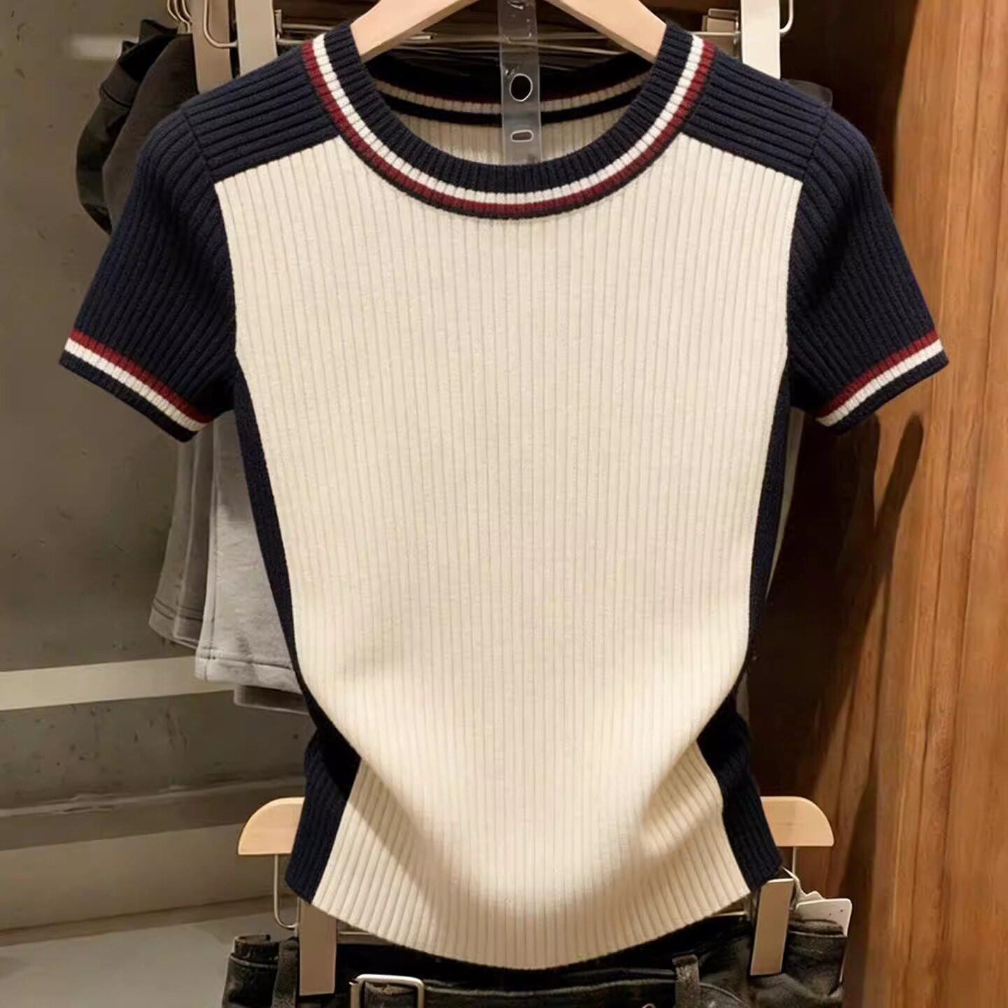 T恤女夏季 撞色条纹短袖 新款 潮流打底衫 显瘦上衣 大码 弹力修身 女装