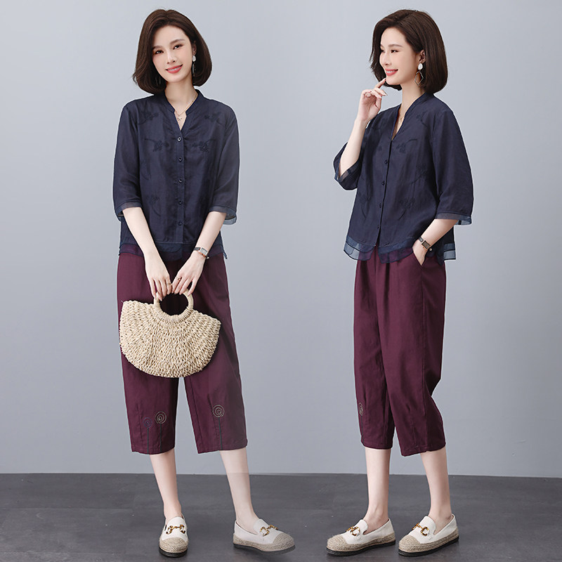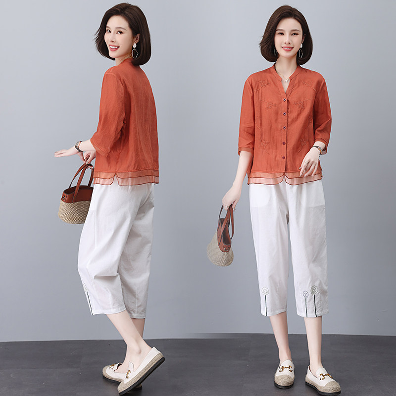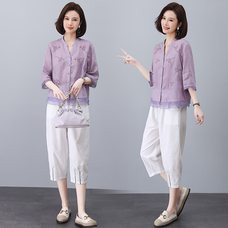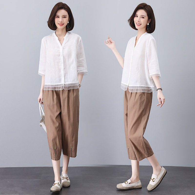 显瘦时尚 通勤风棉麻刺绣衬衫 大码 女夏薄款 两件套 套装