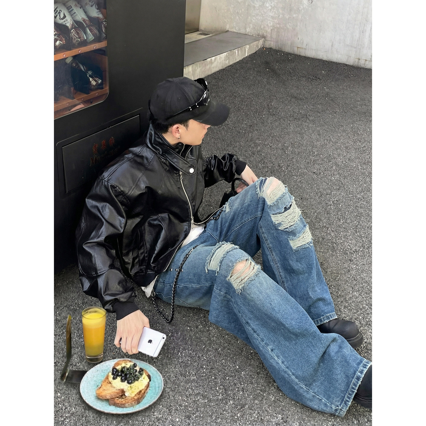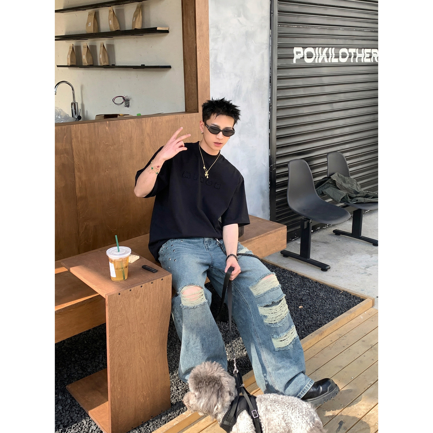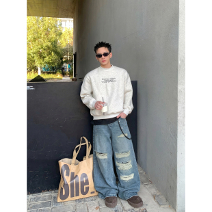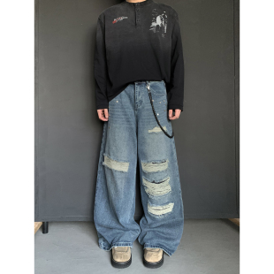 男宽松直筒高街潮流长裤 PLTH 复古大破洞铆钉阔腿牛仔裤 美式 春季