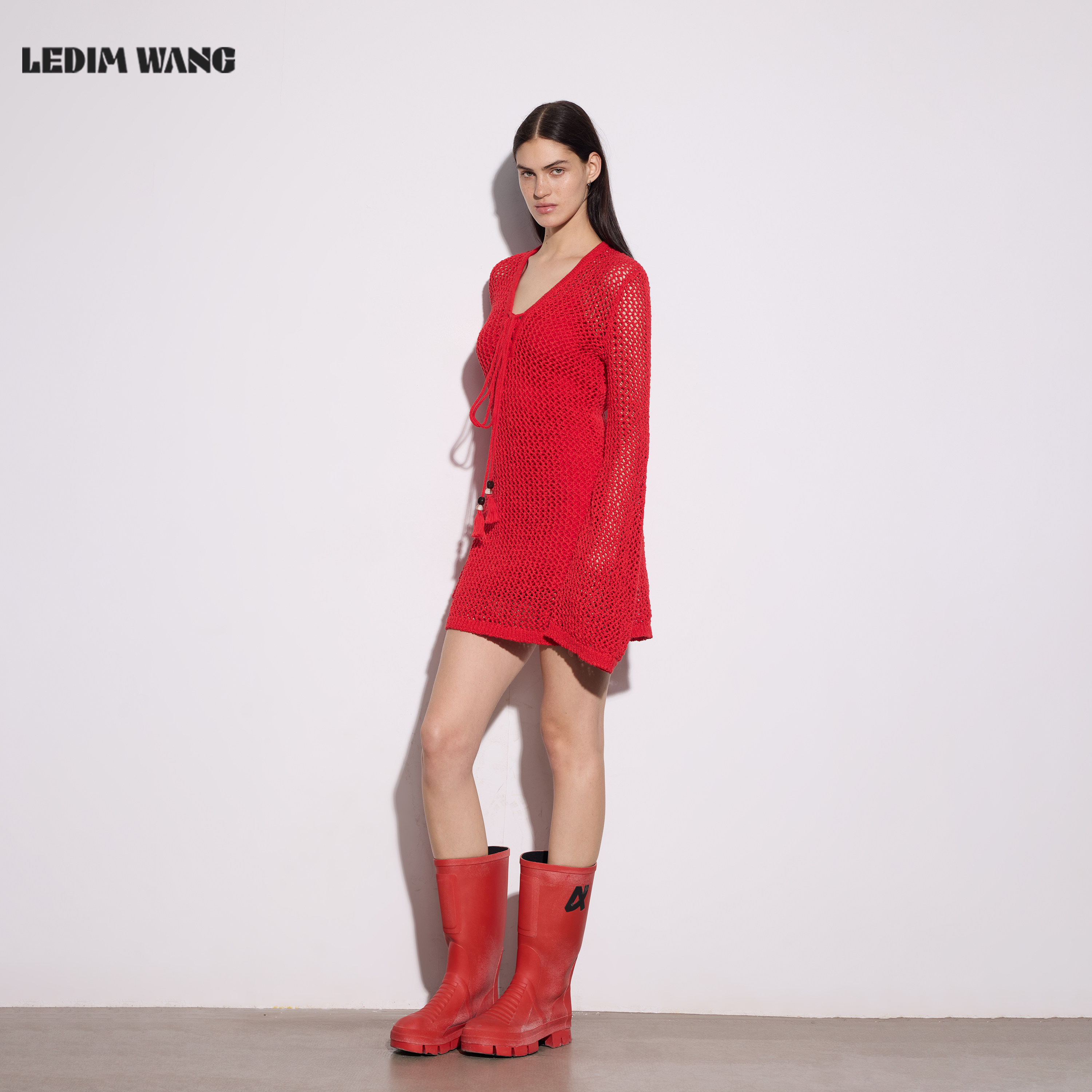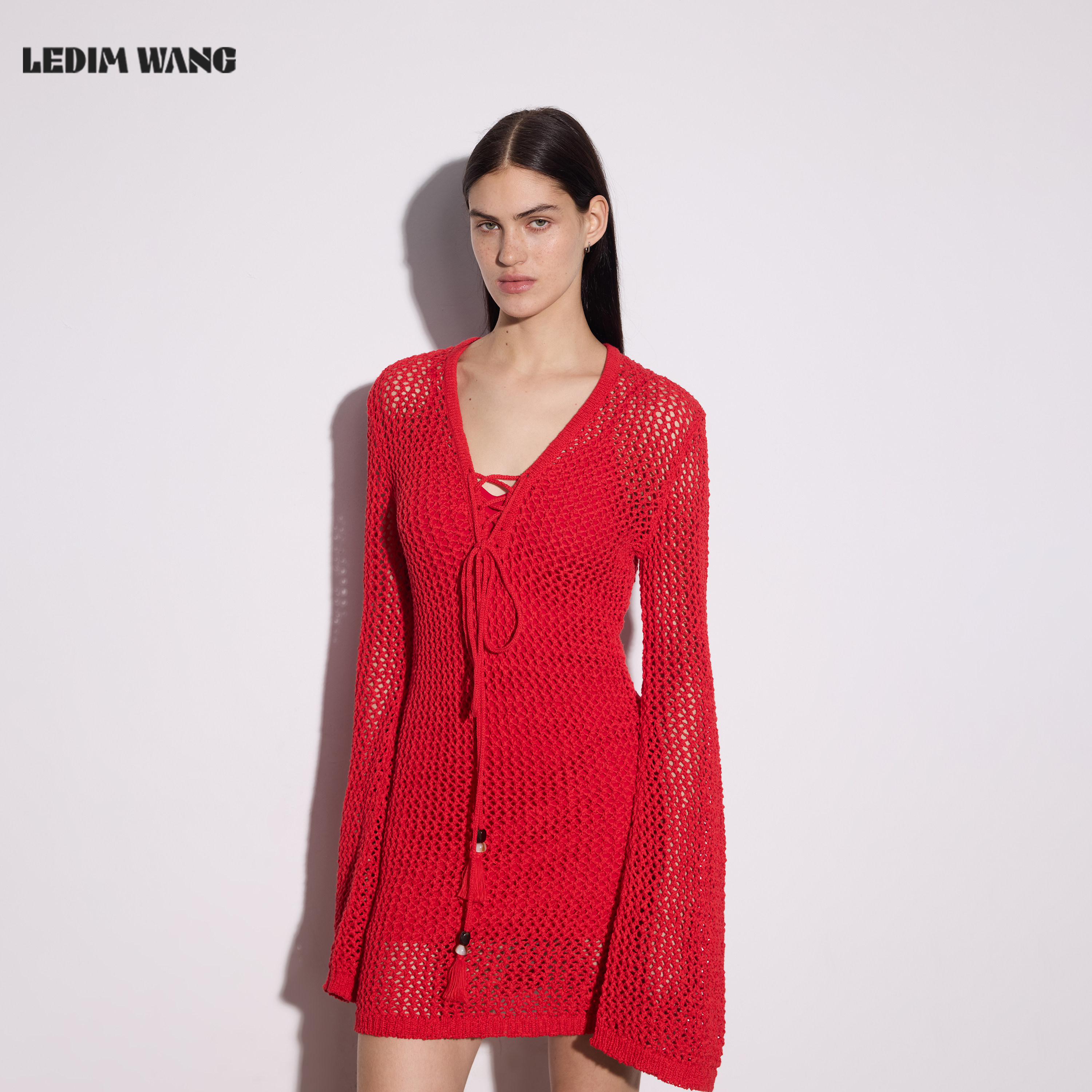休闲短裙 V领红色长袖 LEDIM WANG镂空收腰流苏连衣裙女26早春新款