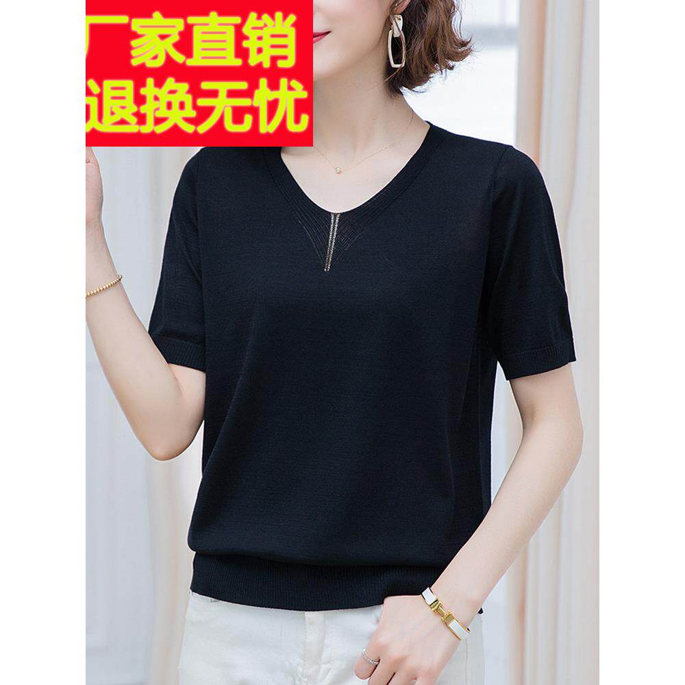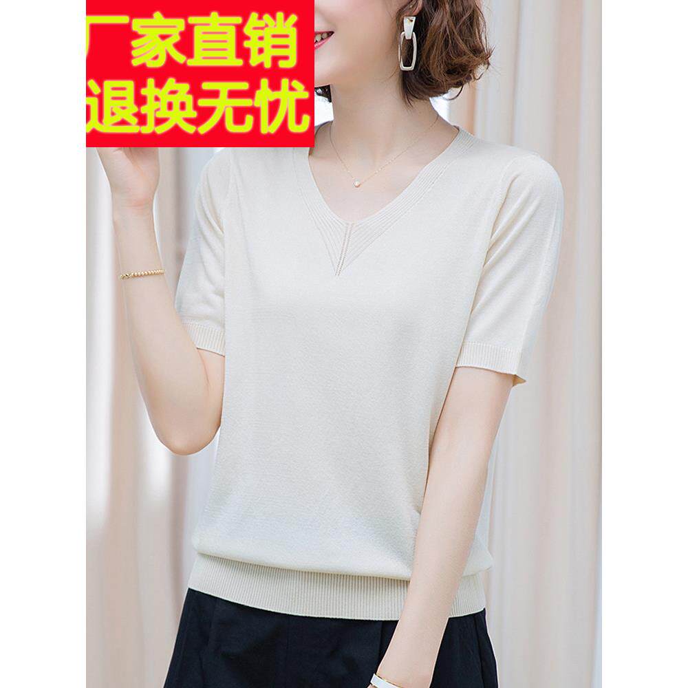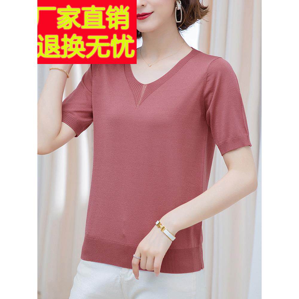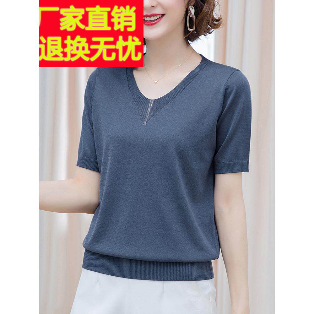 妈妈桑蚕丝短袖 中年女士V领冰丝针织T恤加肥加大 t恤宽松上衣夏季