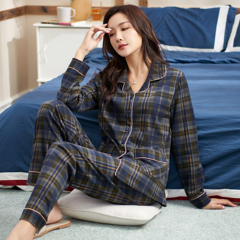 开衫 睡衣女春秋款 大码 2026新款 单件上衣可外穿格子家居服 纯棉长袖
