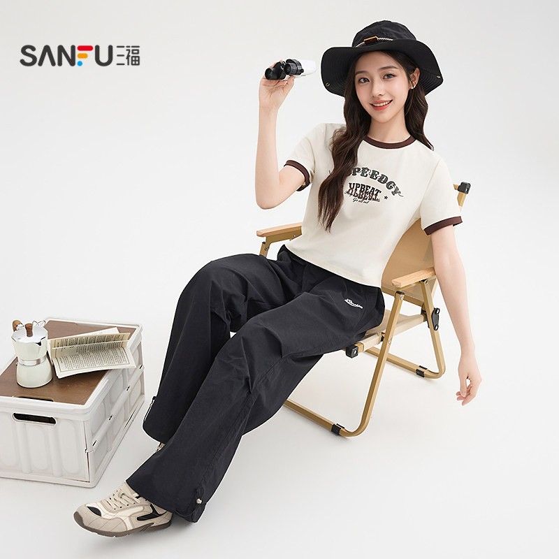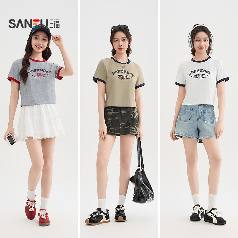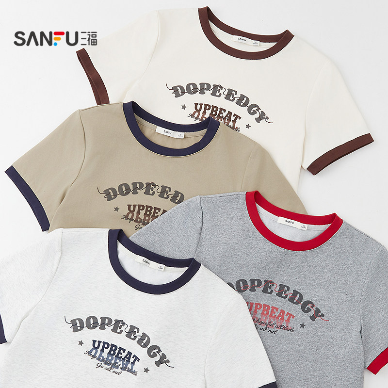 上衣女装 三福短袖 字母印花撞色复古圆领时尚 夏季 T恤女2026新款