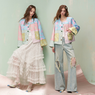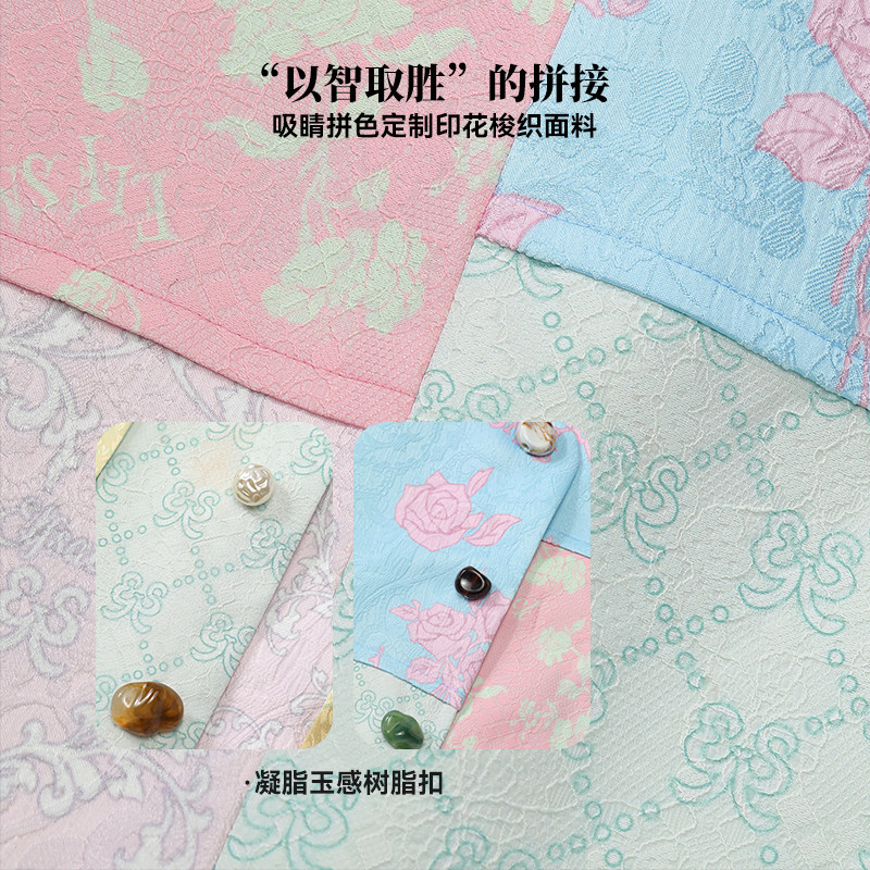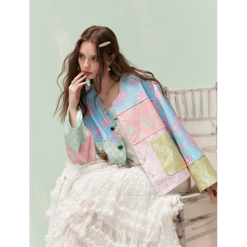 新中式 新款 上衣 口袋原创花卉满印粉蓝拼接外套女2026年春季 妖精