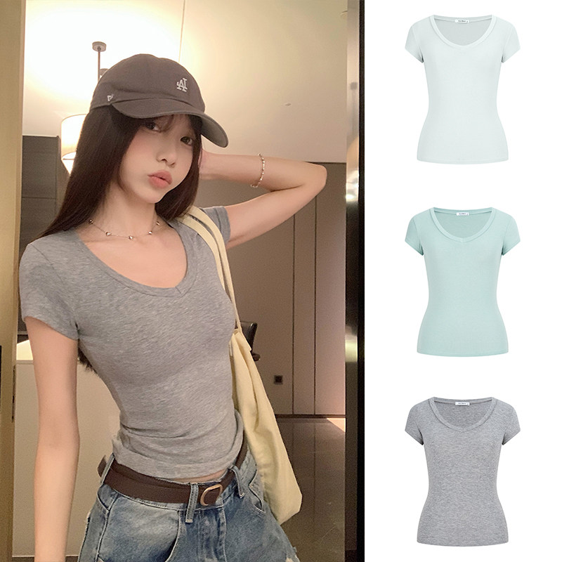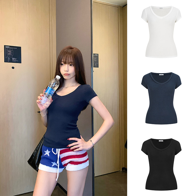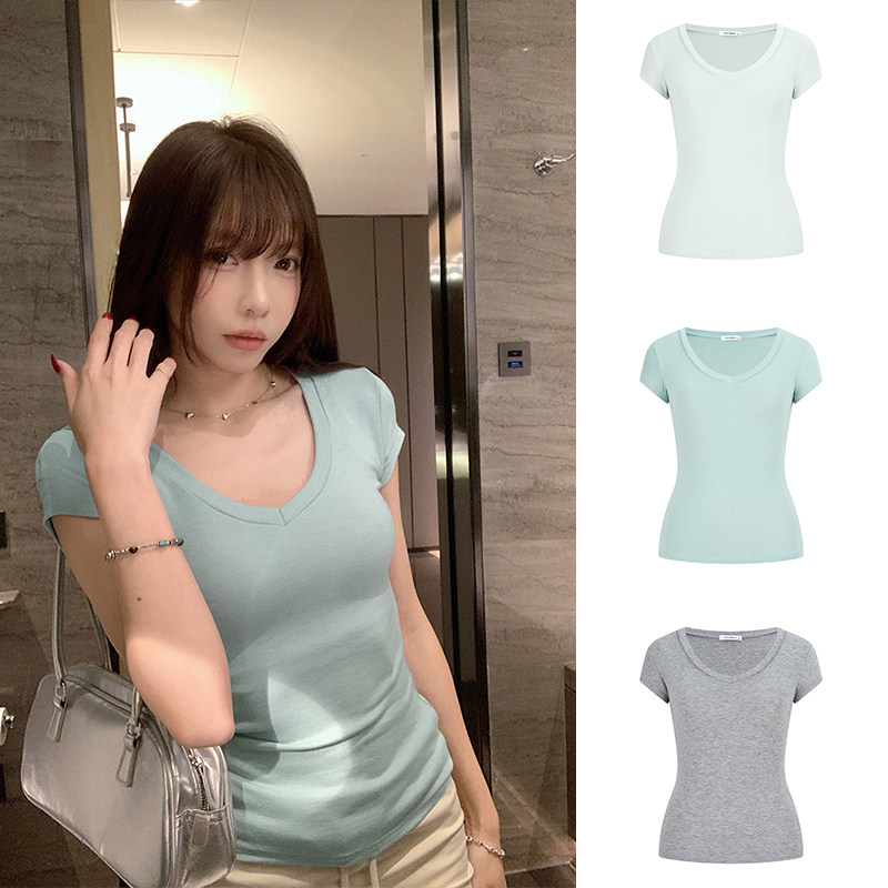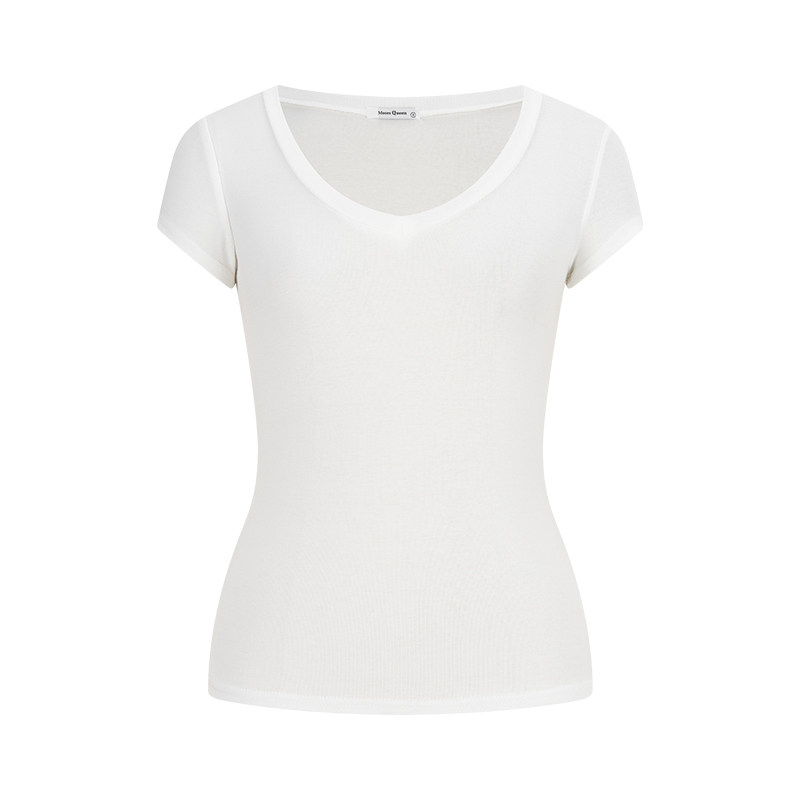 短款 修身 v领上衣 t恤内搭打底衫 MosesQueen魔西女王米白色正肩短袖