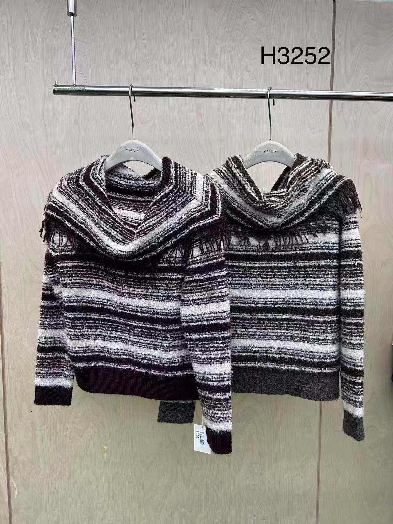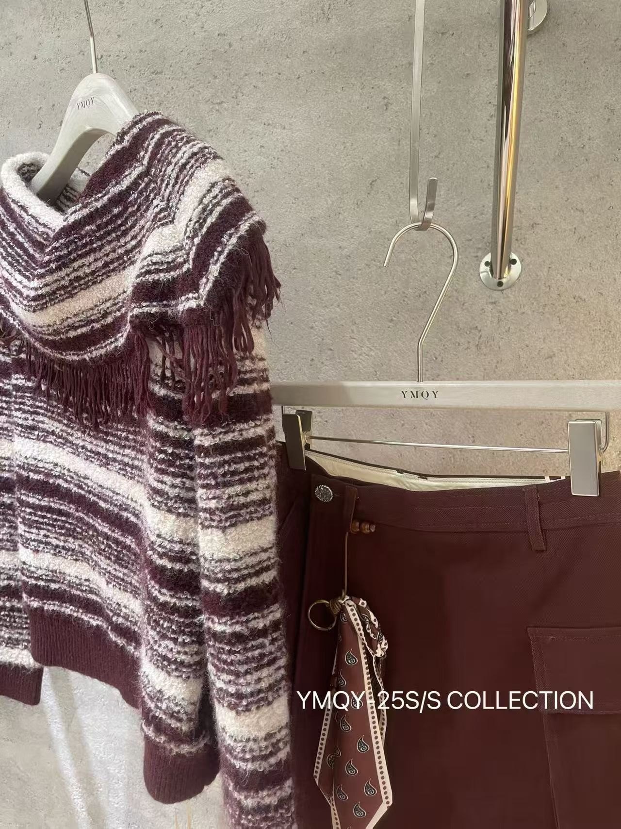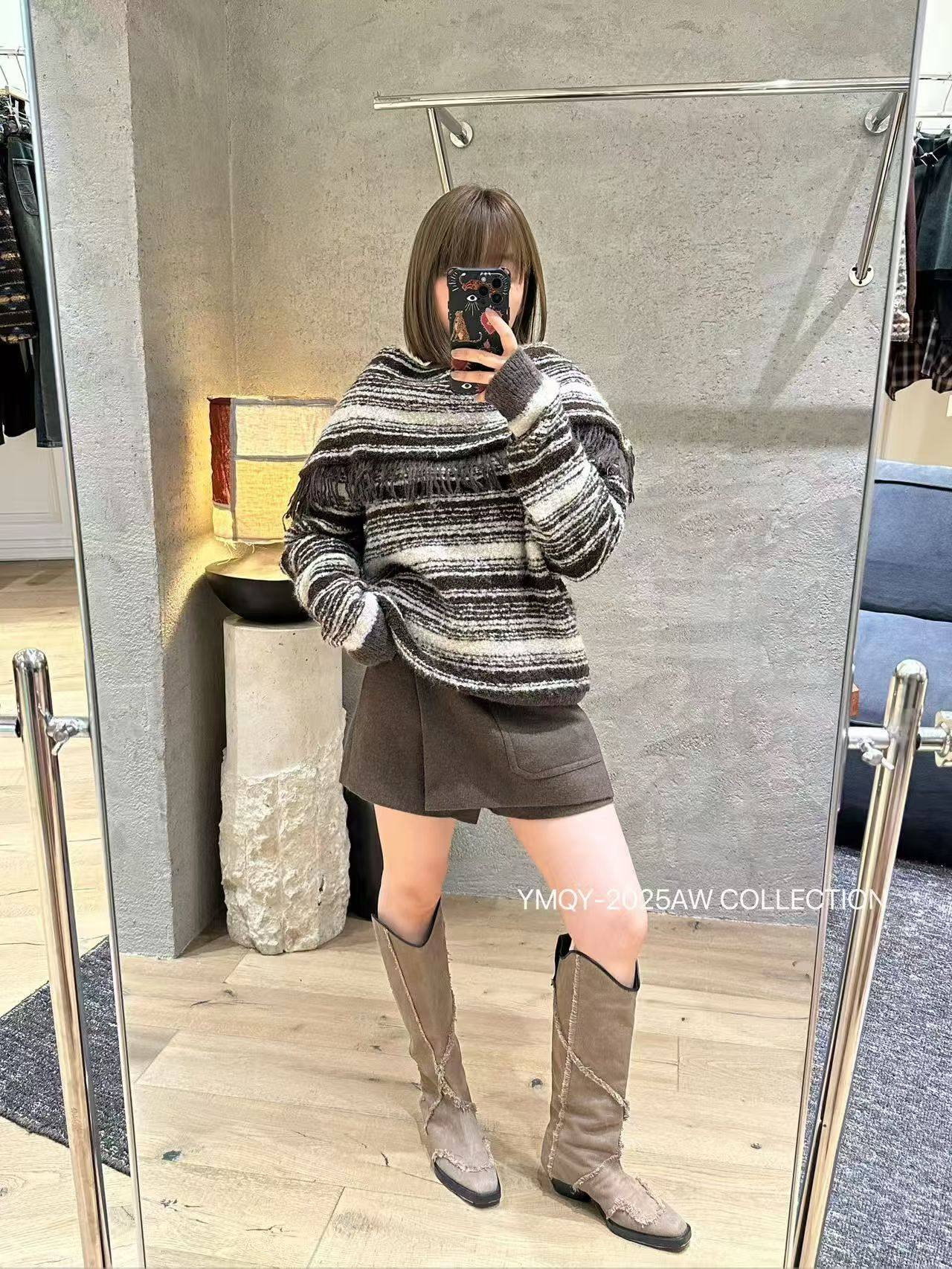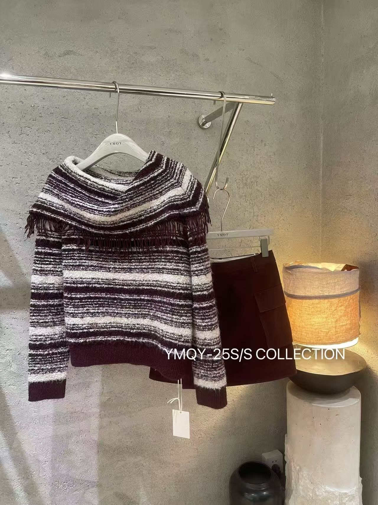 美到心尖上 羊毛手工流苏针织一字肩撞色条纹毛衣女 miu系小富贵