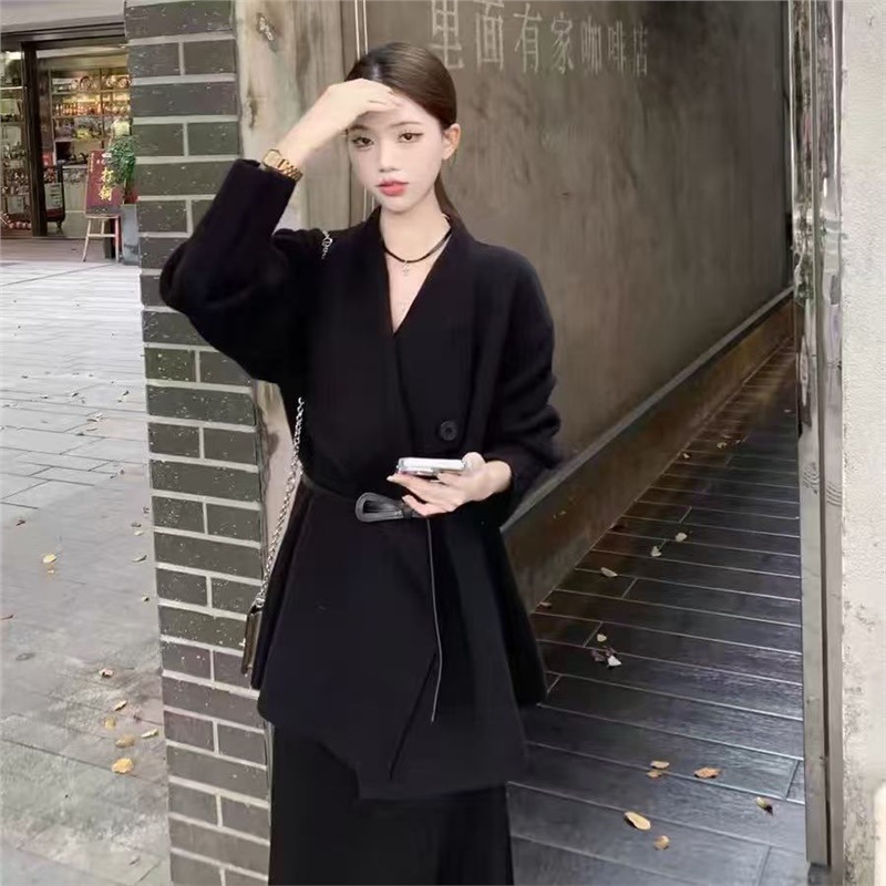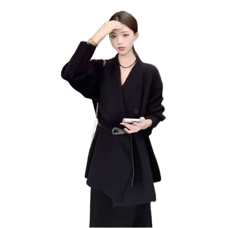 韩系氛围感翻领系带针织开衫 宽松慵懒加厚毛衣收腰外套 女秋冬新款