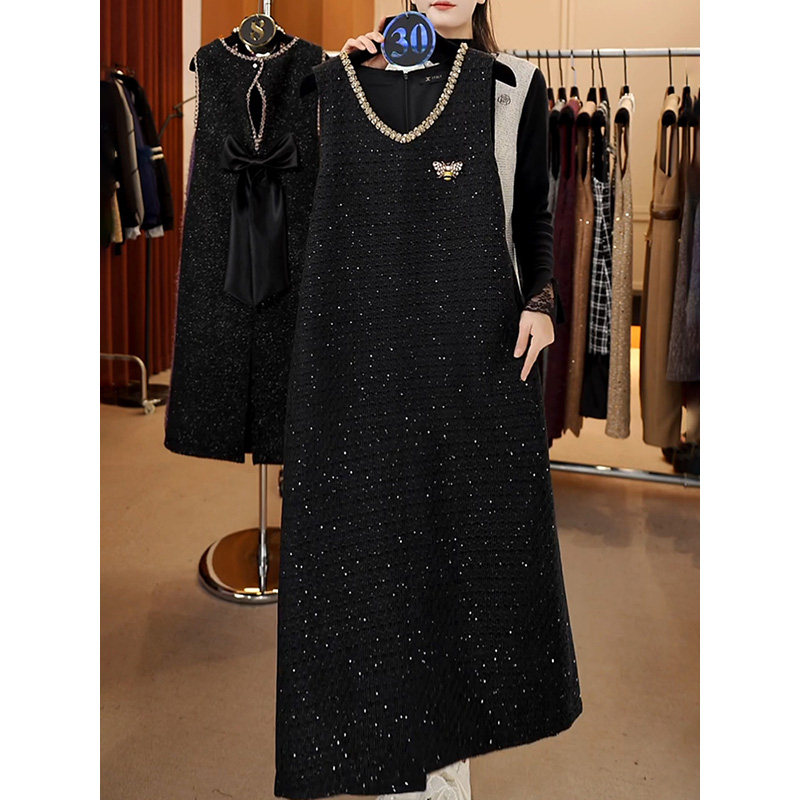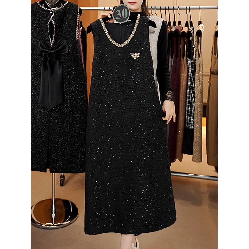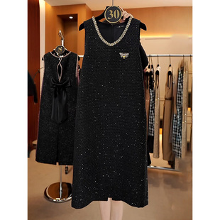 XWI欣未优雅气质垂感V领连衣裙女2025年春秋内搭收腰显瘦小黑裙
