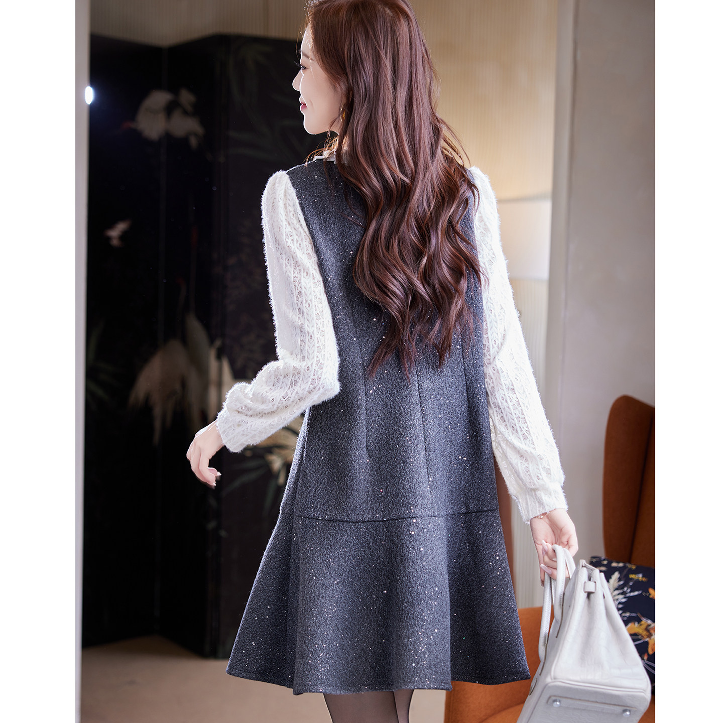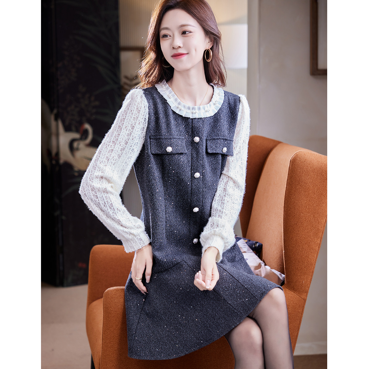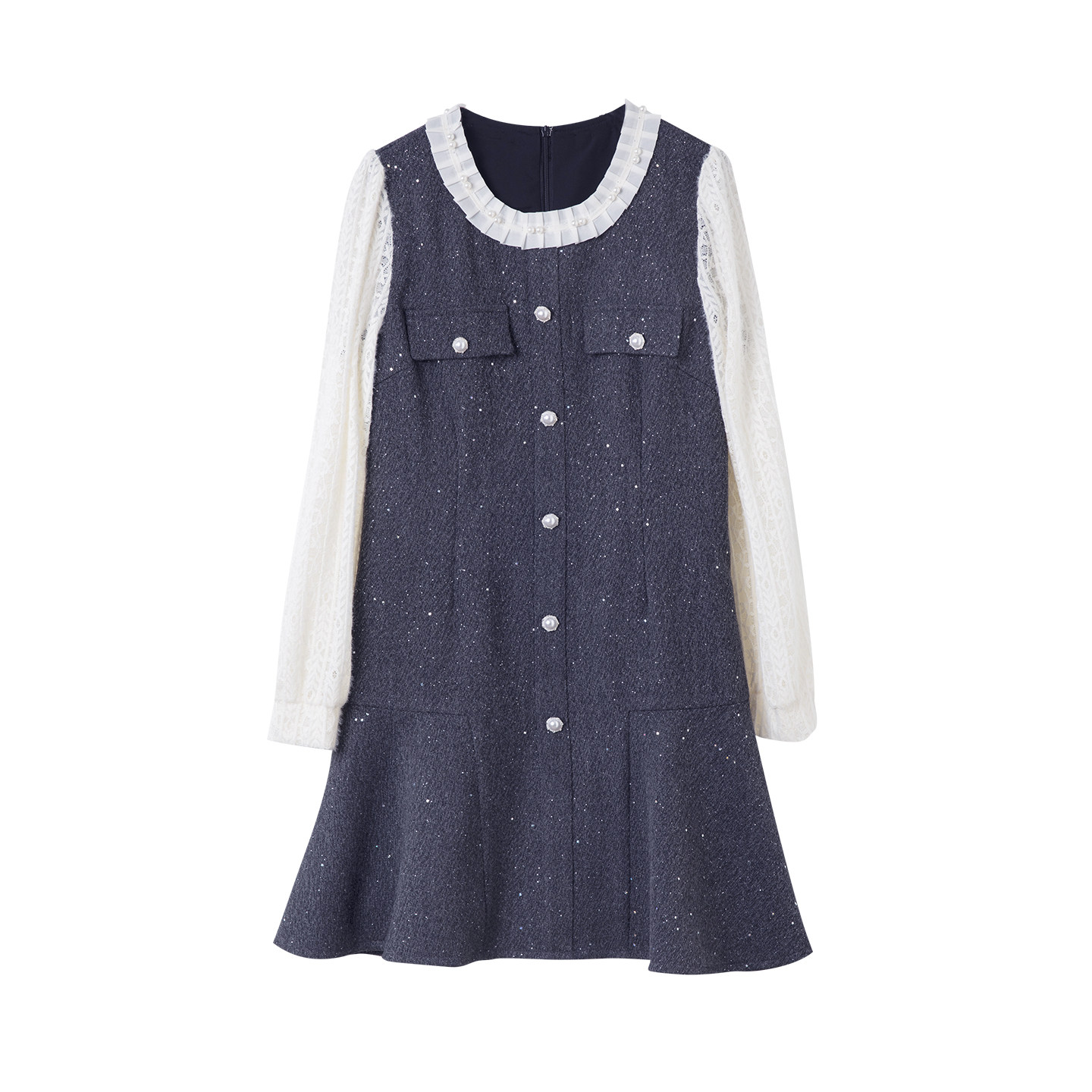 宝诗黎蕾丝钉珠拼接连衣裙2025冬季 气质韩系假两件小香风休闲裙