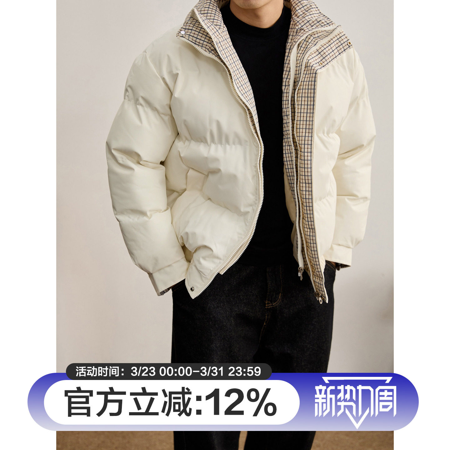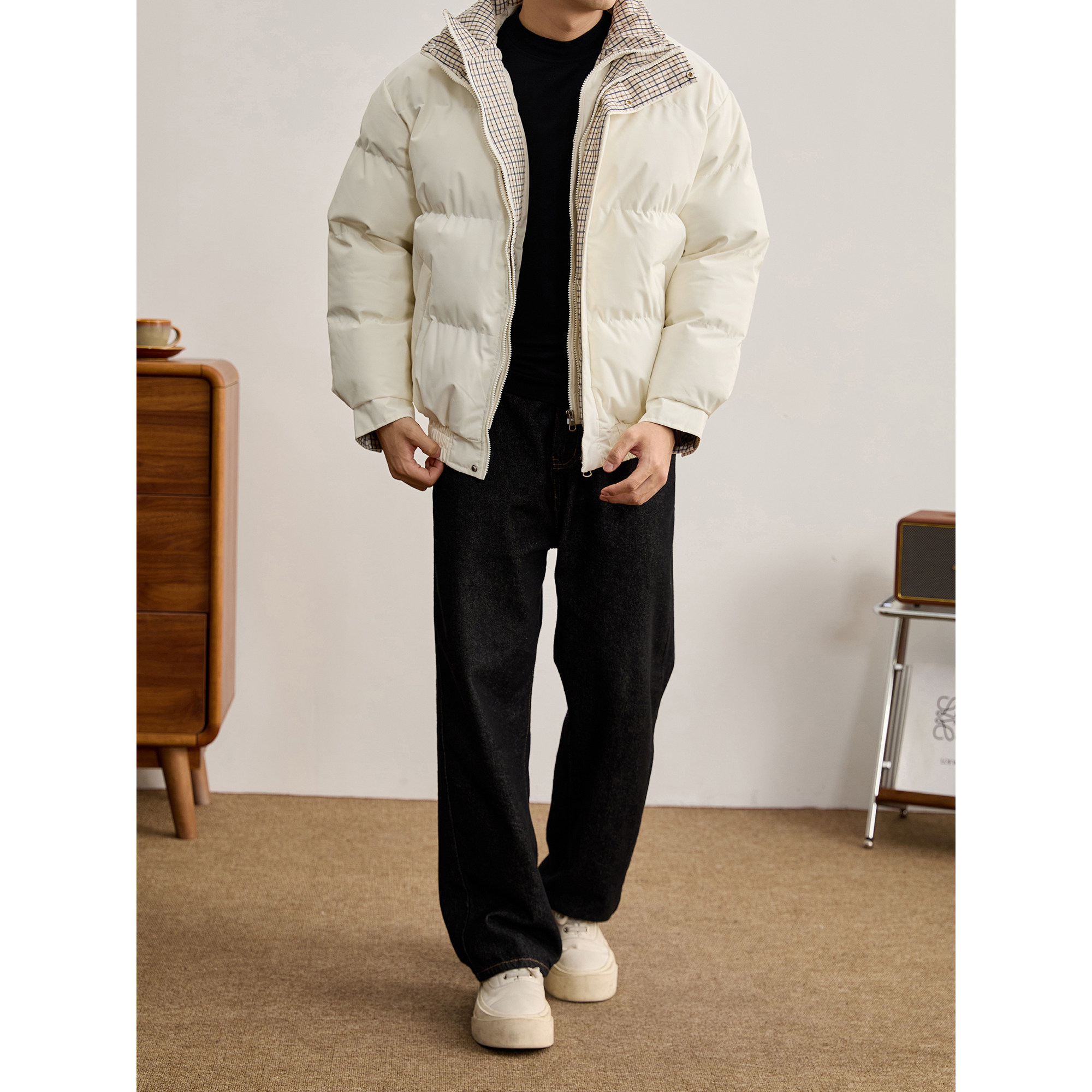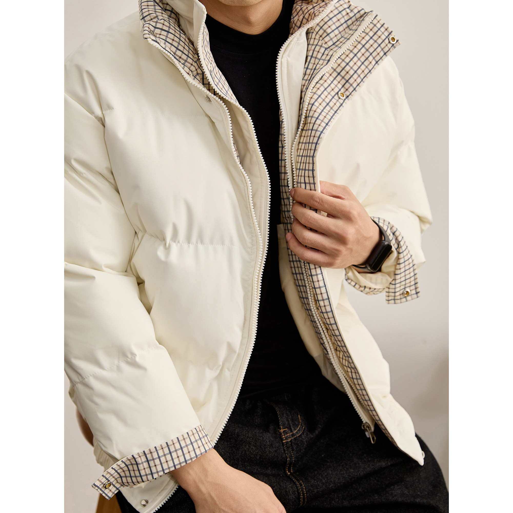 LUUD 内里夹棉轻盈保暖棉服男假两件格纹内衬双门襟棉衣外套 冬季