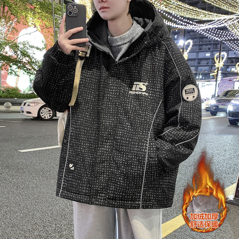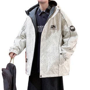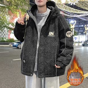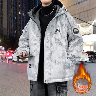 士 休闲宽松连帽冲锋衣服潮流外套男装 夹克男生加绒加厚秋冬季 新款