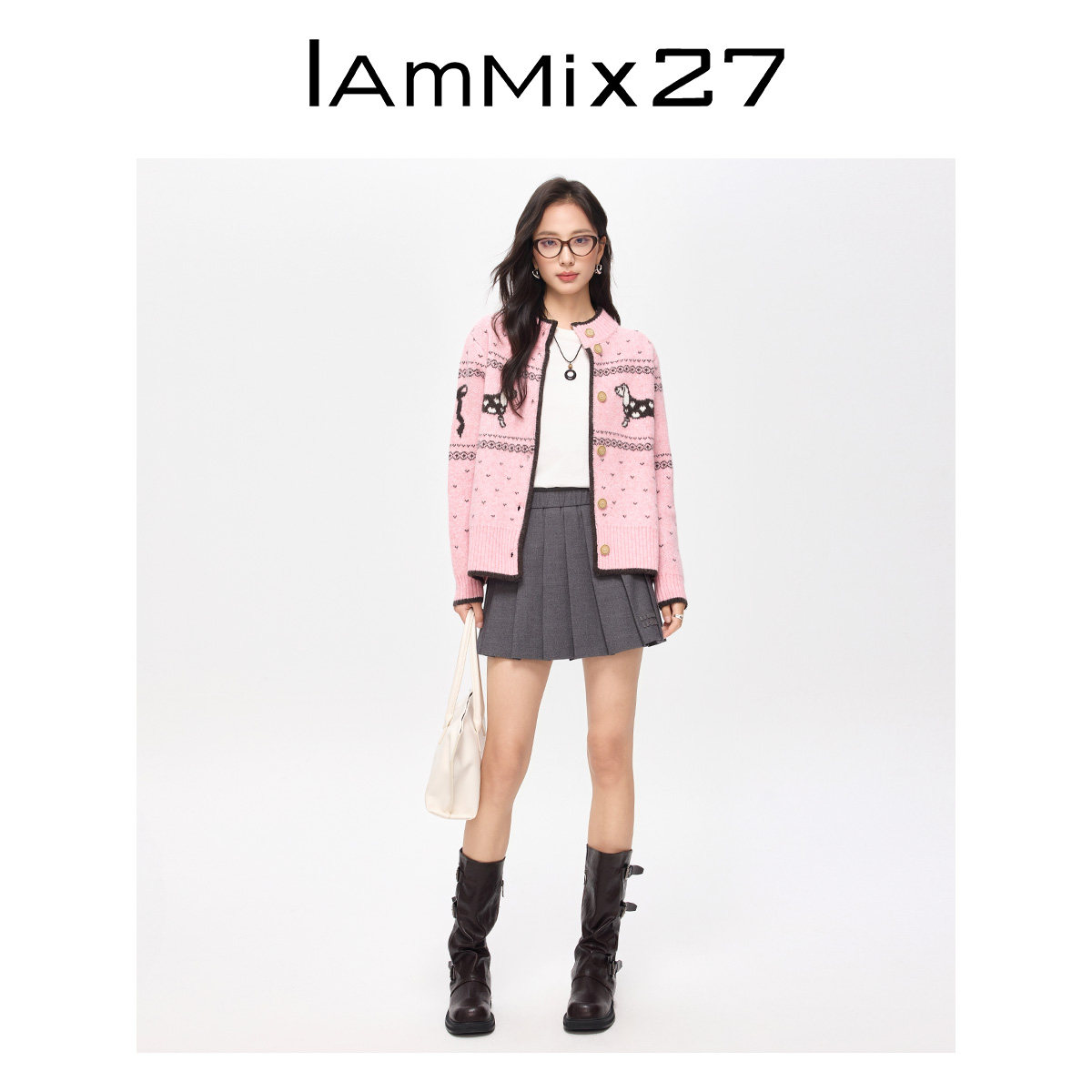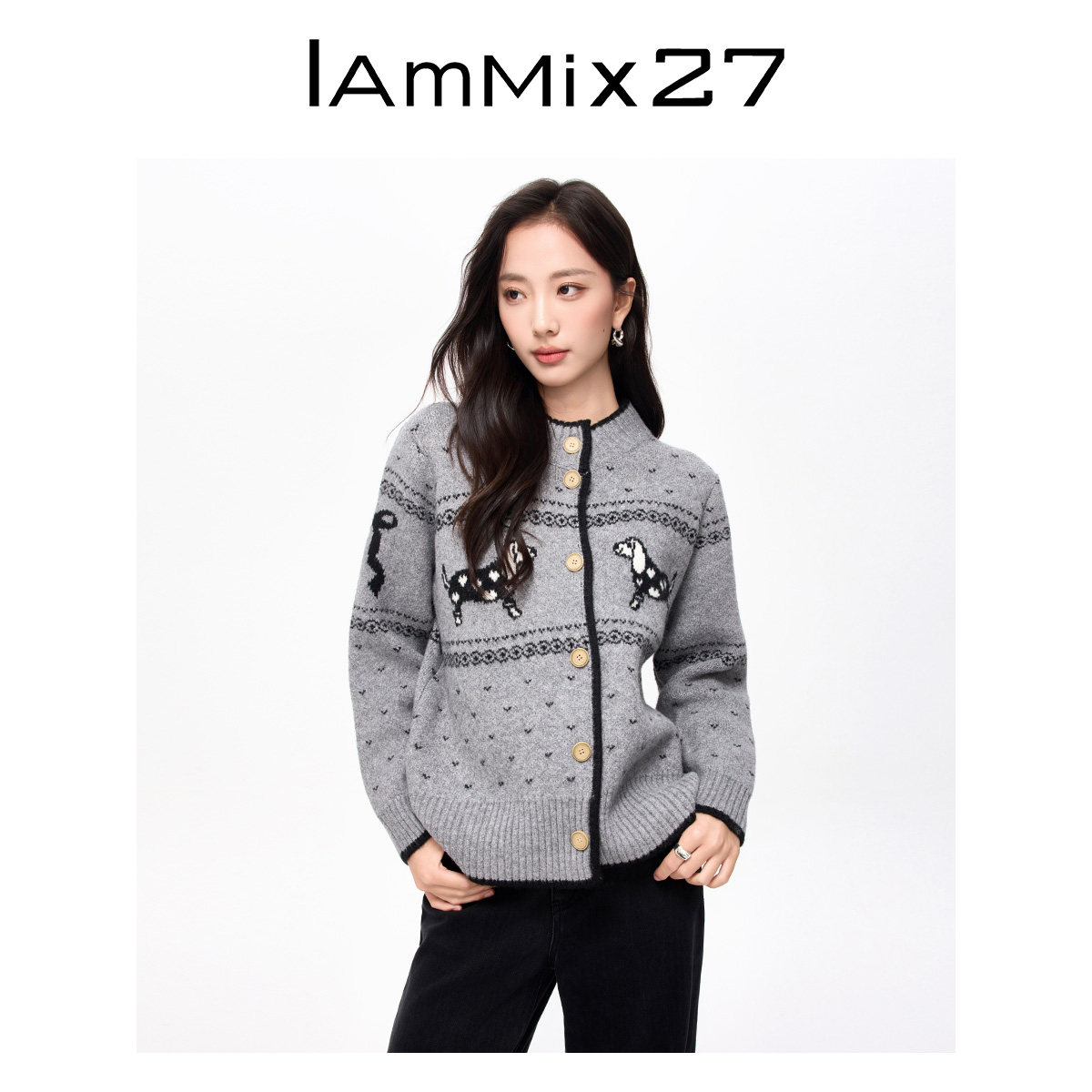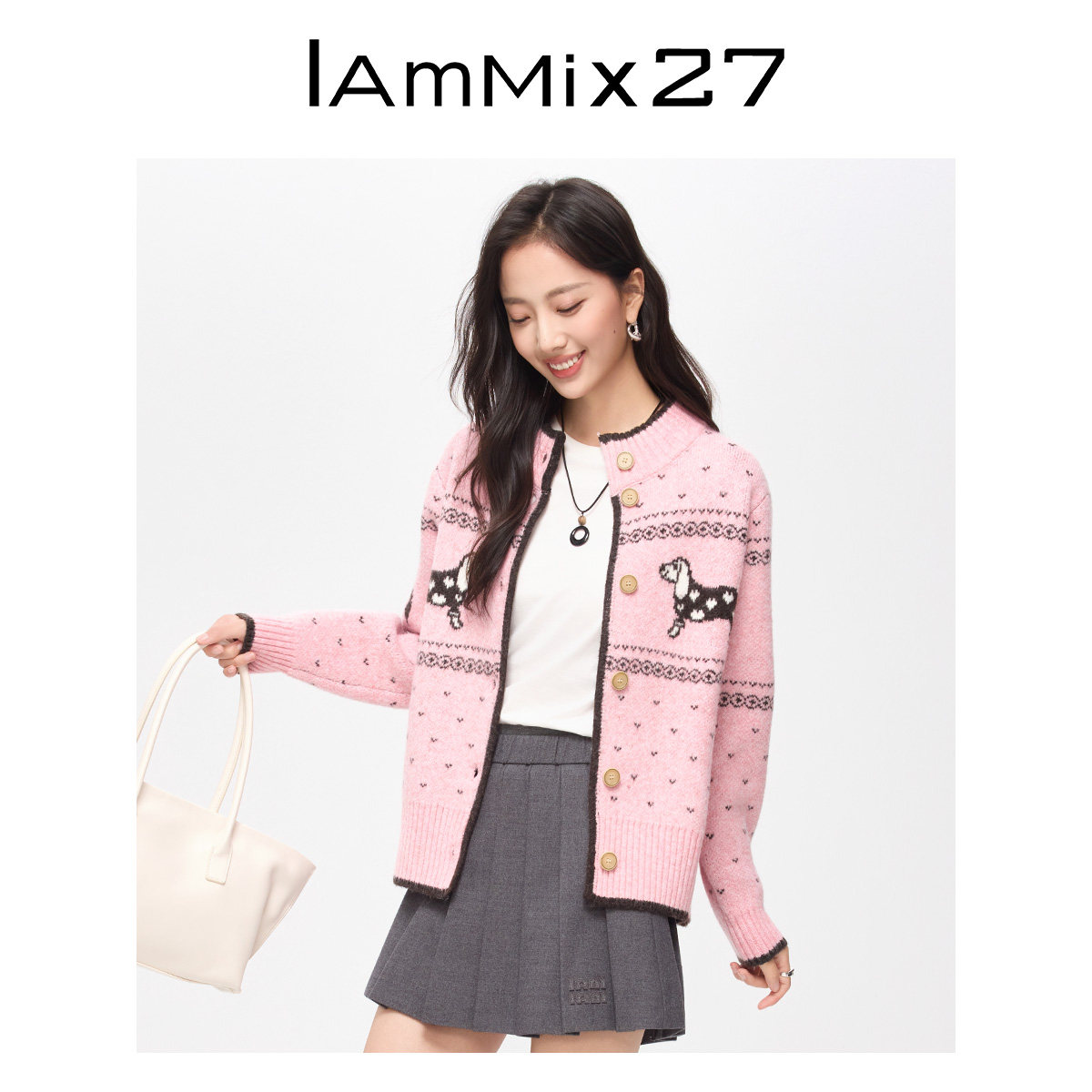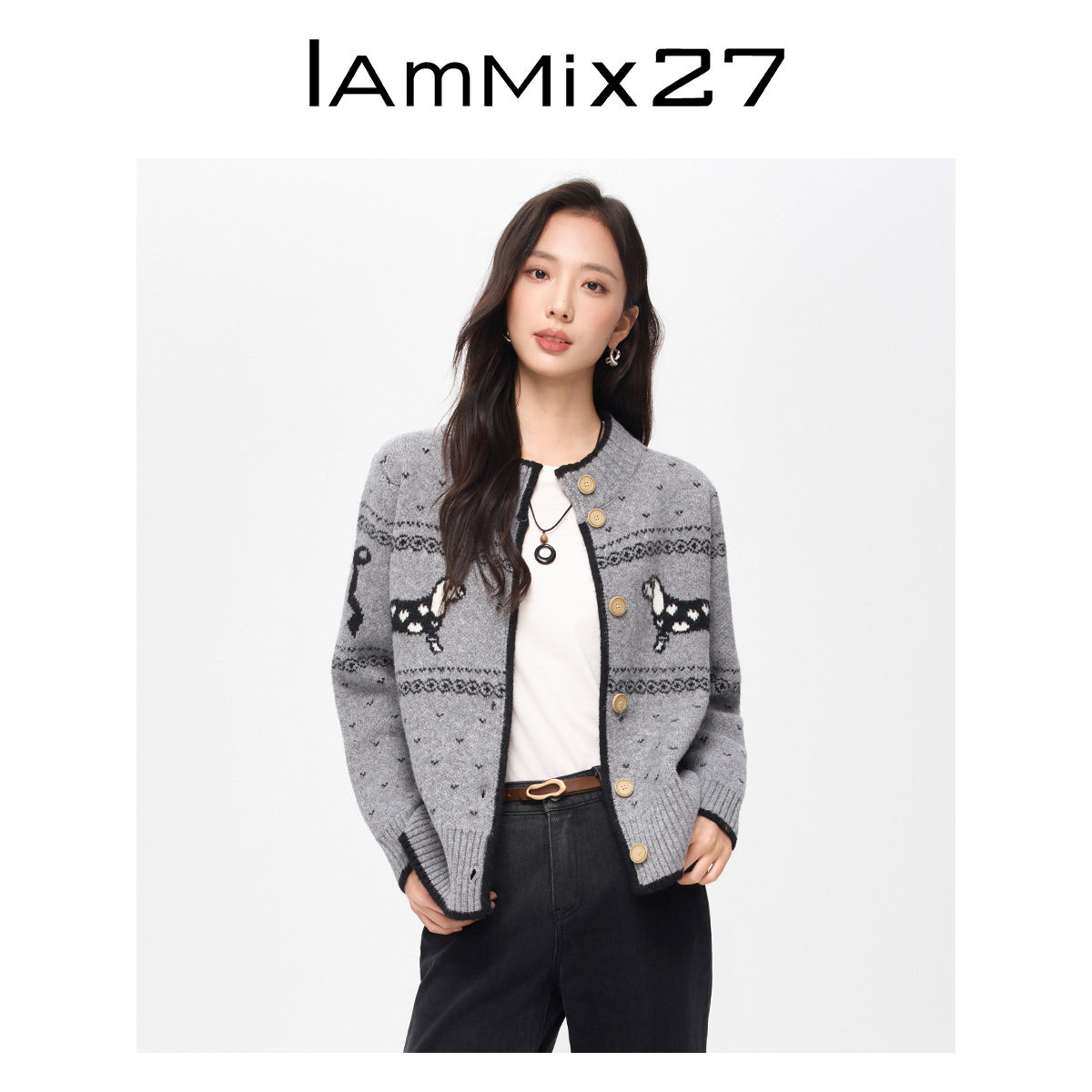 IAmMIX27春秋针织开衫 减龄提花软糯羊毛混纺圆领毛衣女宽松 女长袖
