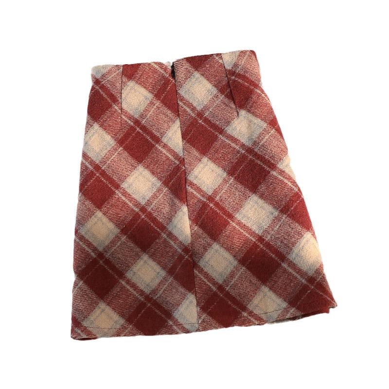 毛呢格子半身裙女秋冬天u配毛衣新款 百搭高腰包臀裙红色a字短裙