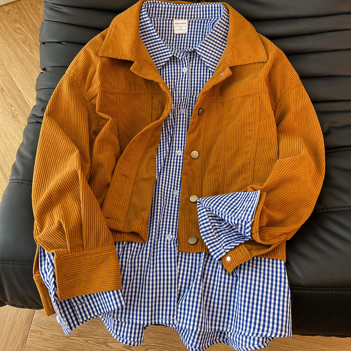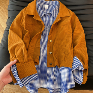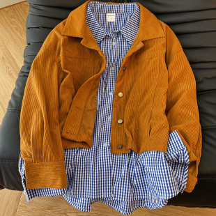 女大方得体秋冬套装 南韩麻豆 衬衫 外套格子长袖 复古风灯芯绒短款