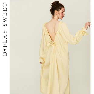DPLAYSWEET法式 睡裙可拆卸手工花家居服露背宽松睡衣晨袍女士 长袖