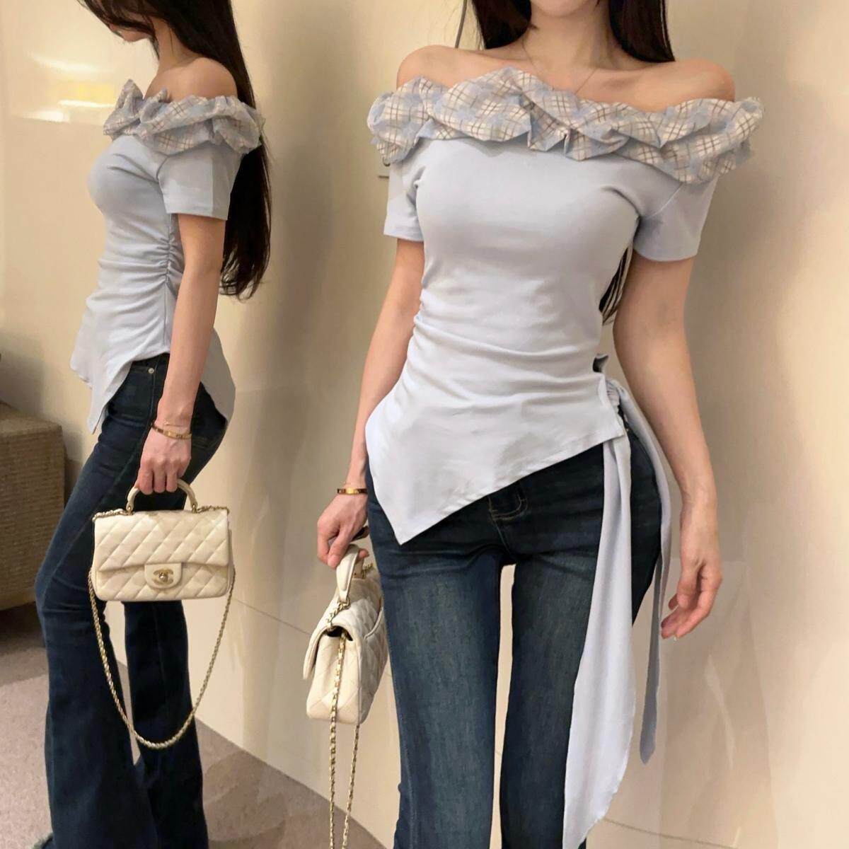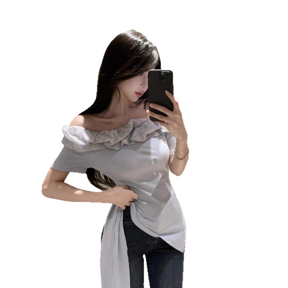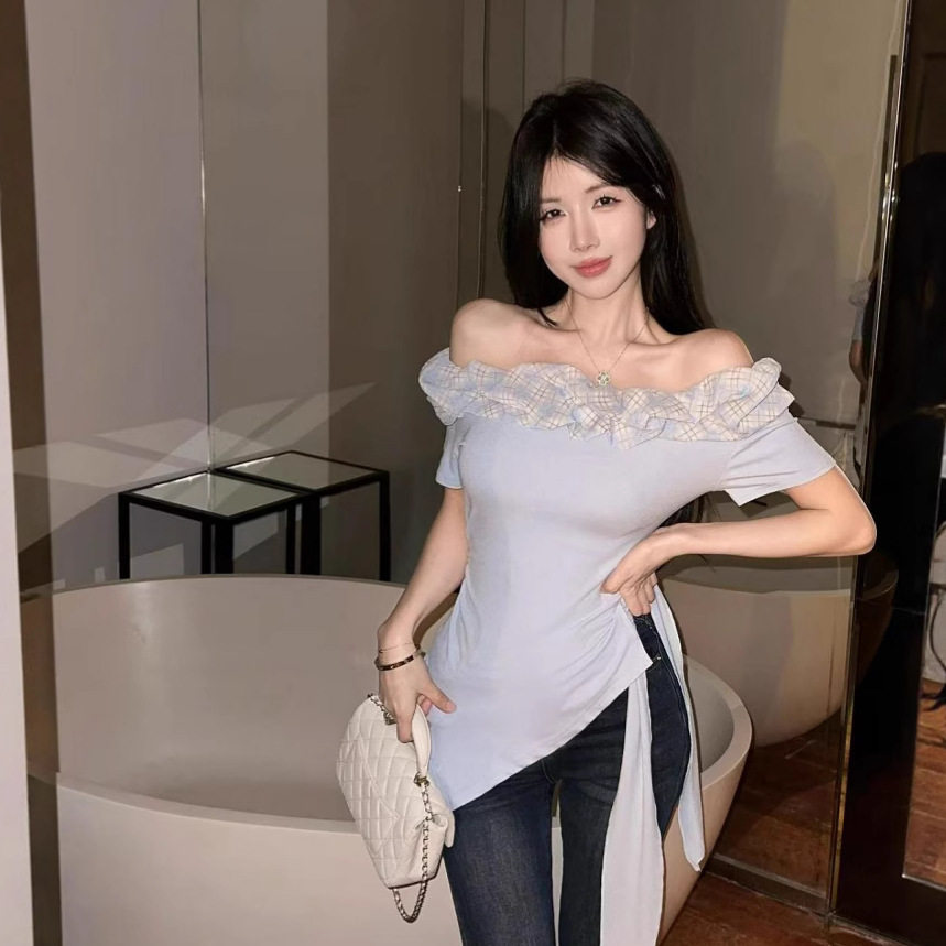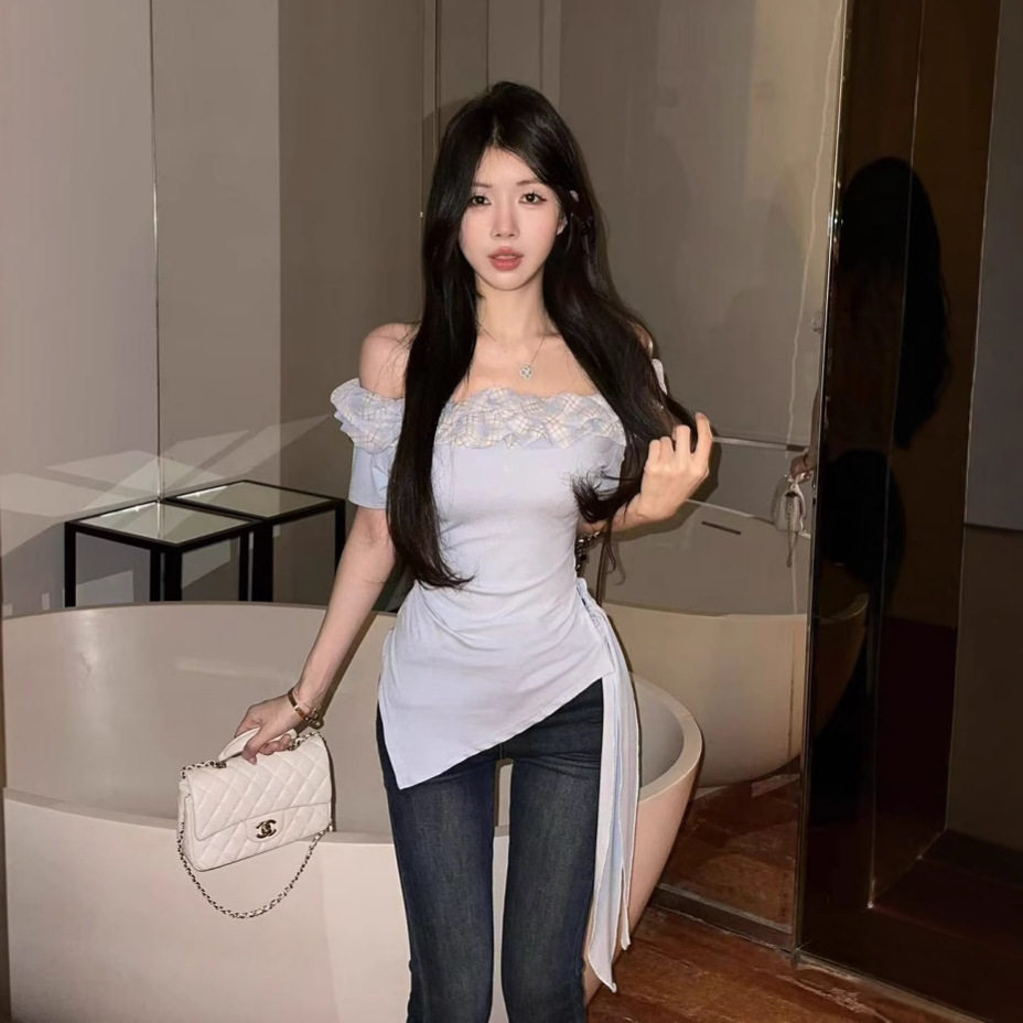 收腰上衣 纯欲风荷叶边露肩花边修身 小众设计感斜肩短袖 T恤女夏季