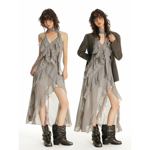 USS 早秋格纹雪纺连衣裙挂脖露背荷叶边收腰设计感不规则度假长裙