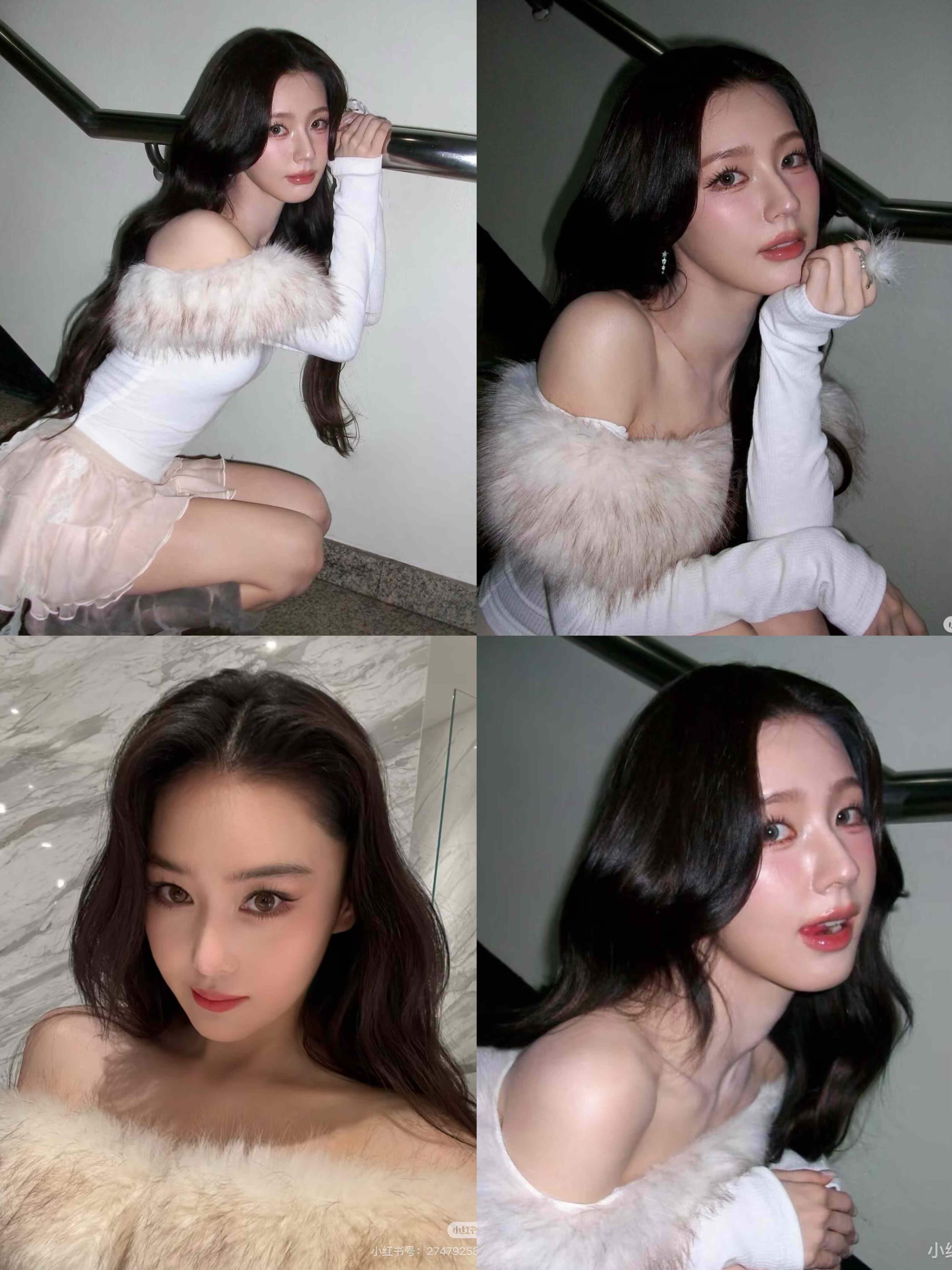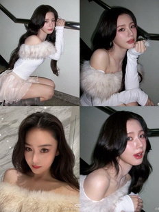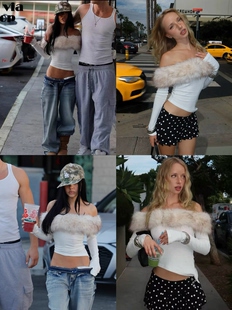 上衣 现货 螺纹长袖 纯色毛领一字肩修身 毛领可拆 赵美延张馨予同款