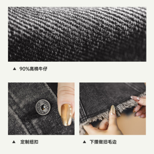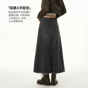 马登烟灰色复古开衩牛仔高腰毛边半身裙显瘦A字伞中长裙子女士春