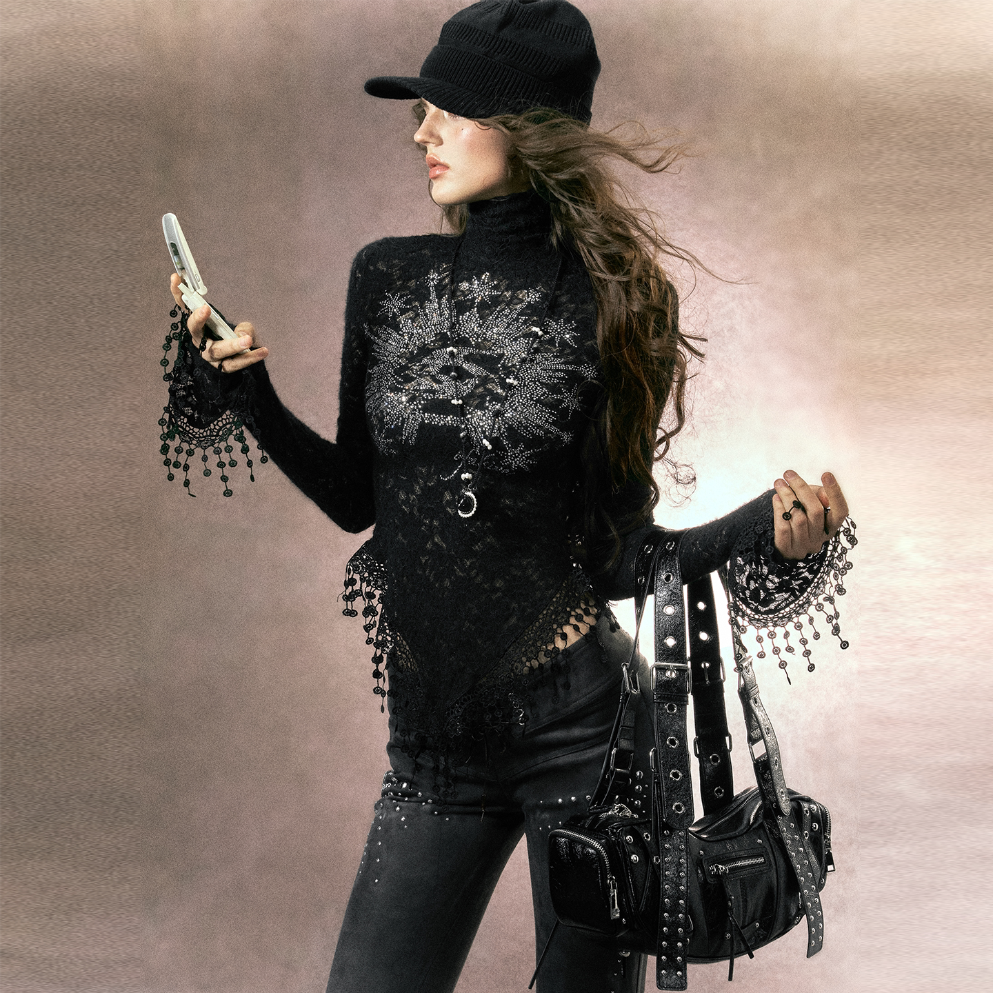 肌理蕾丝上衣 打底衫 OfAkiva 千金氛围玫瑰烫钻高领修身