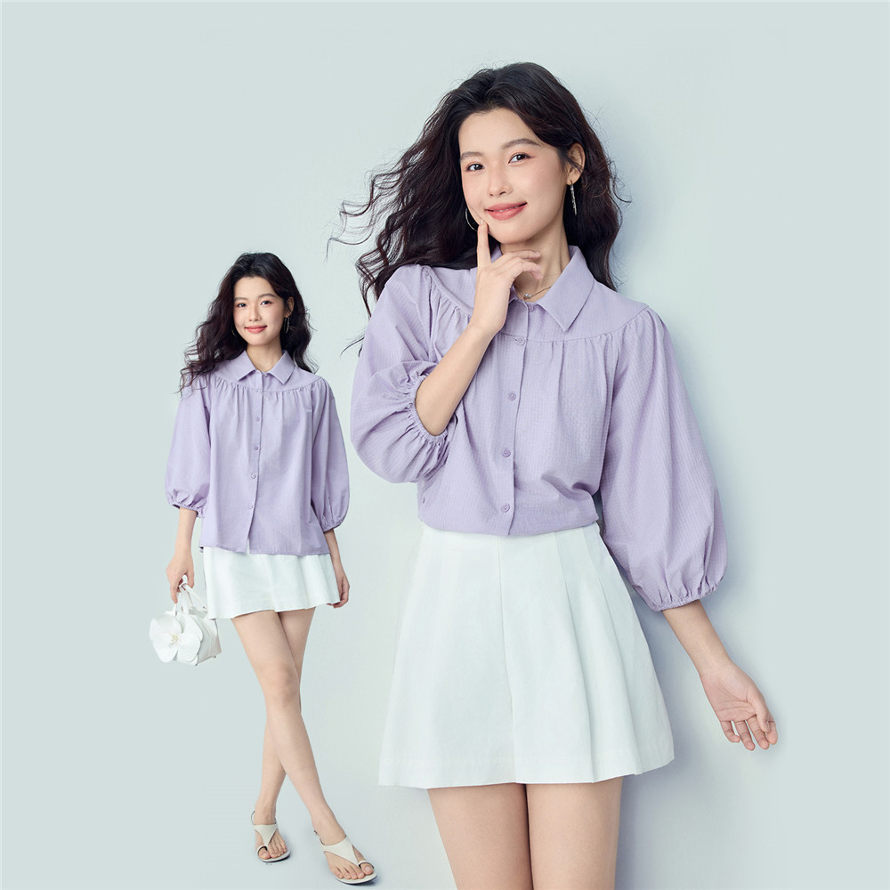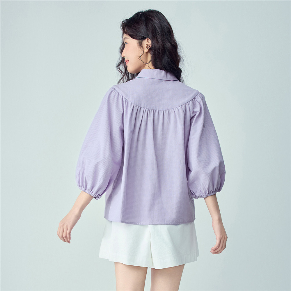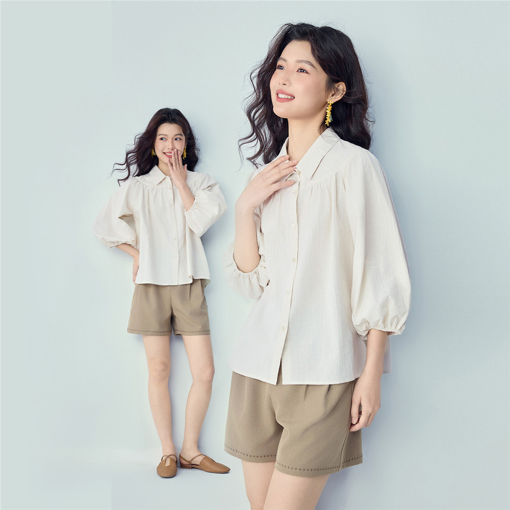 女13346255 衬衫 佐丹奴2026年夏新款 纯棉肌理感宽松碎褶七分泡泡袖