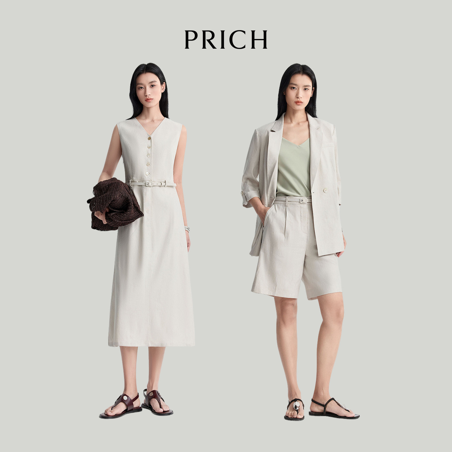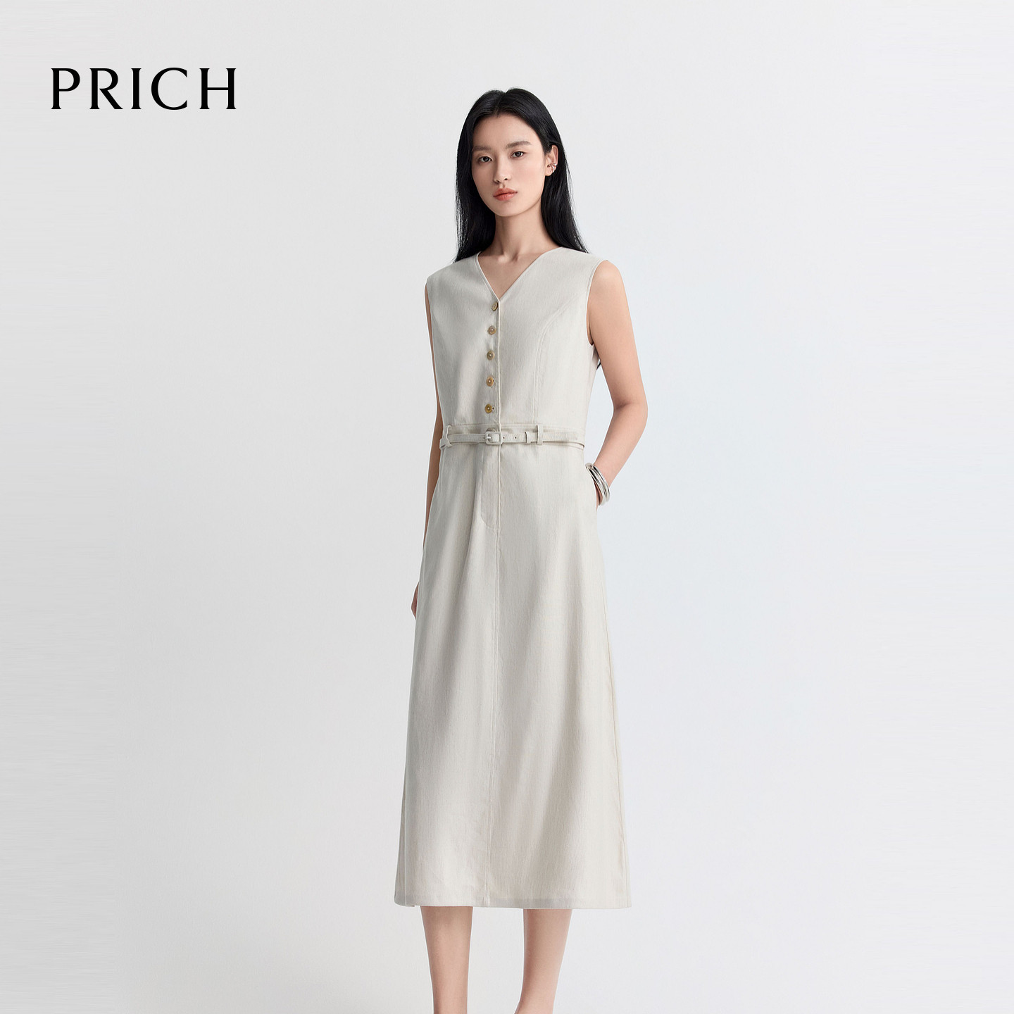 亚麻 新款 PRICH法式 收腰连衣裙2026夏季 休闲气质裙子女 V领无袖