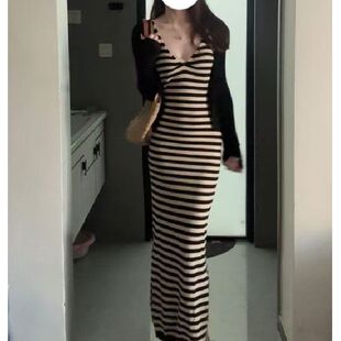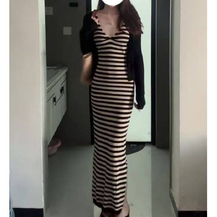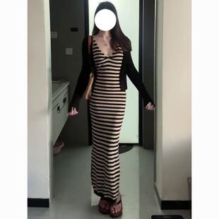 纯欲风吊带长裙 气质修身 2025法式 V领条纹包臀连衣裙套装