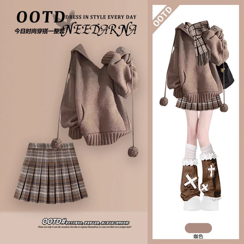 超级好看冬装 咖色针织毛衣百褶裙子一整套 套裙女美拉德穿搭秋冬季
