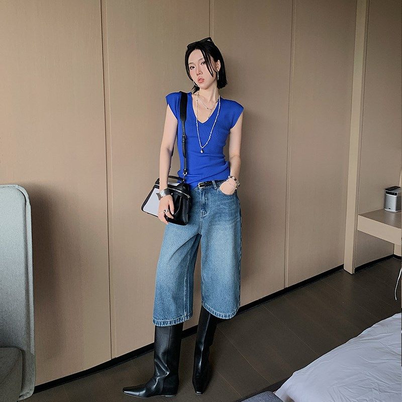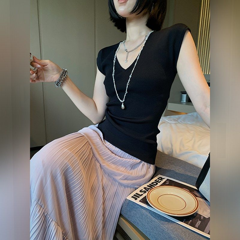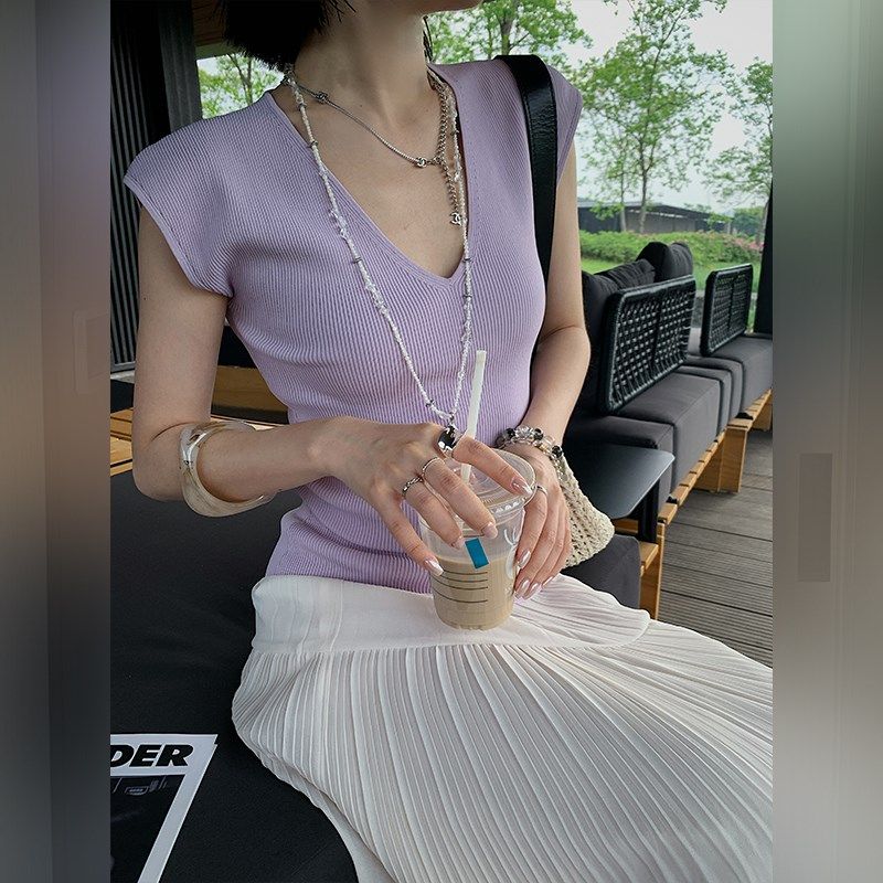 针织T恤女气质百搭修身 简约V领小飞袖 显瘦上衣夏 纵向情诗 十三粥