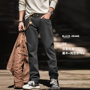 水洗显瘦硬汉直筒丹宁长裤 复古黑色中腰牛仔裤 子男秋 美式 马登工装